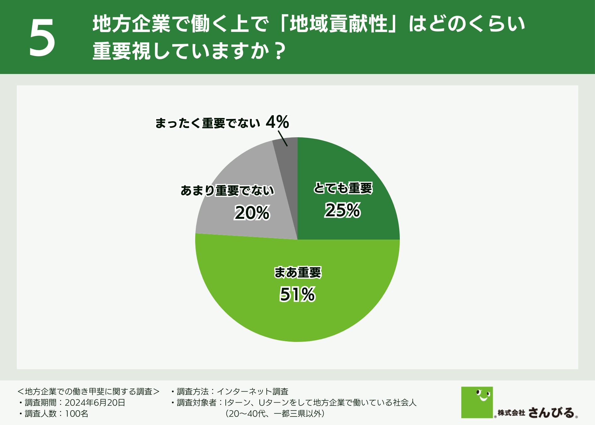 続いて、地方企業で働く上で「地域貢献性」はどのくらい重要視しているか伺ったところ、「まあ重要(51.0%)」「とても重要(25.0%)」という回答が集まりました。