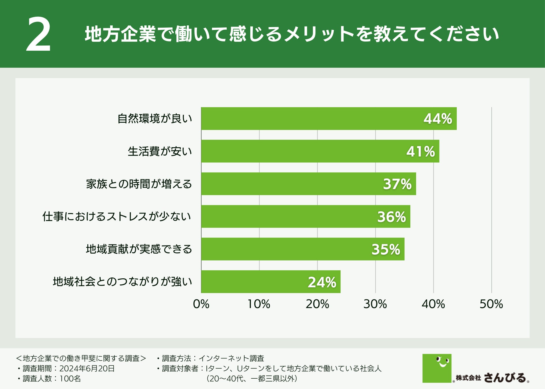 次に、地方企業で働いて感じるメリットを伺ったところ、「自然環境が良い(44.0%)」「生活費が安い(41.0%)」「家族との時間が増える(37.0%)」「仕事におけるストレスが少ない(36.0%)」という回答が集まりました。