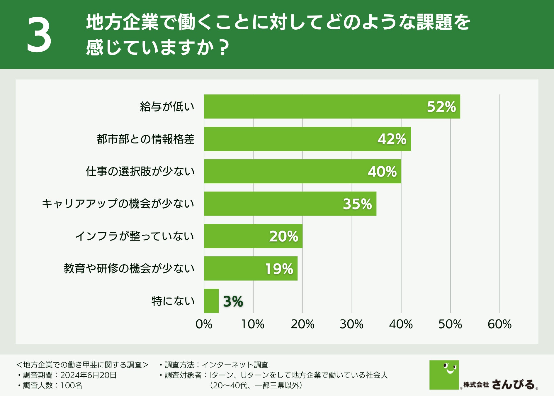 では逆に、地方企業で働くことに対してどのような課題を感じているか伺ってみたところ、「給与が低い(52.0%)」という回答が最も多い結果となりました。