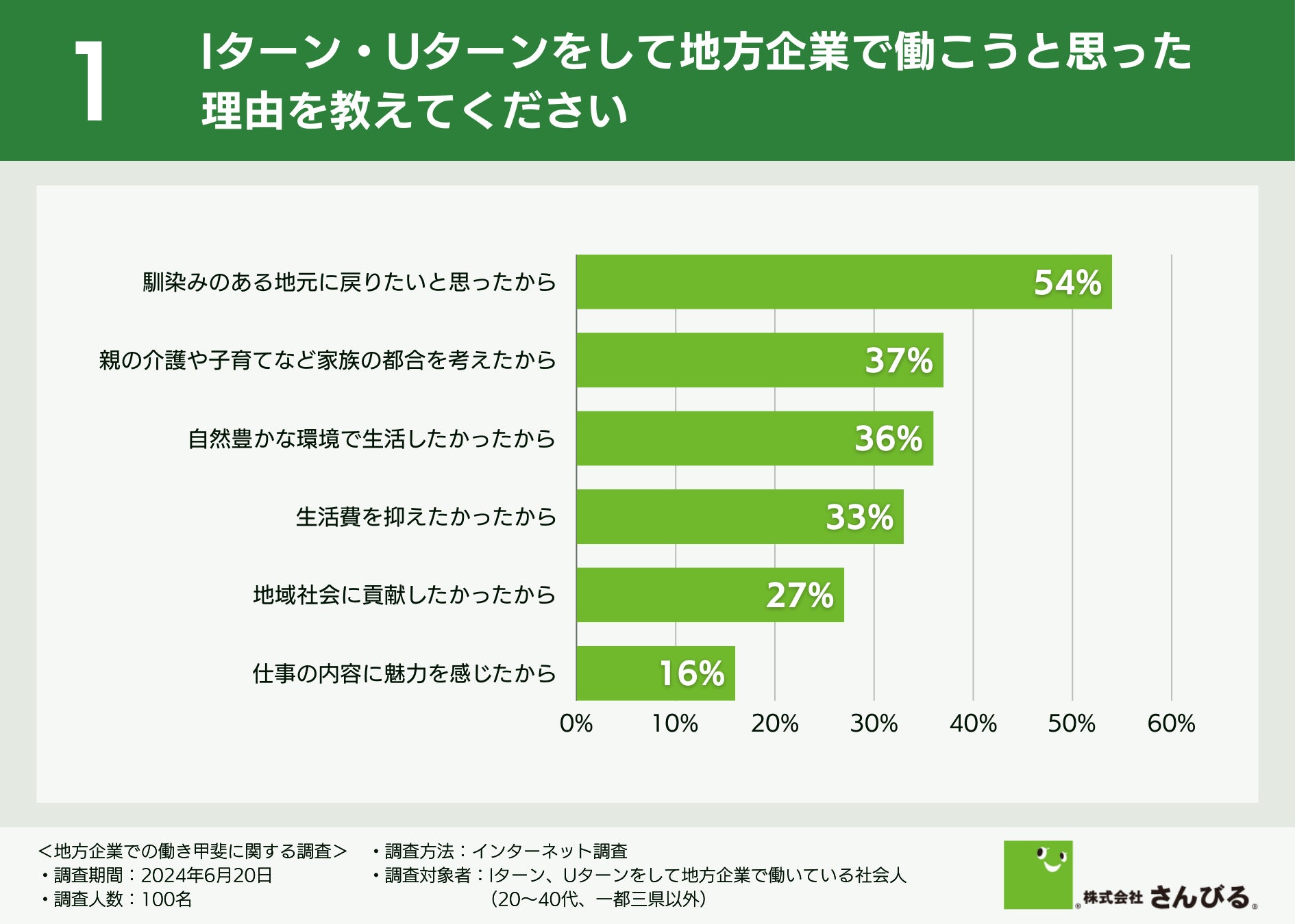 はじめに、Iターン・Uターンをして地方企業で働こうと思った理由を伺ったところ、「馴染みのある地元に戻りたいと思ったから(54.0%)」と回答した方が最も多い結果となりました。