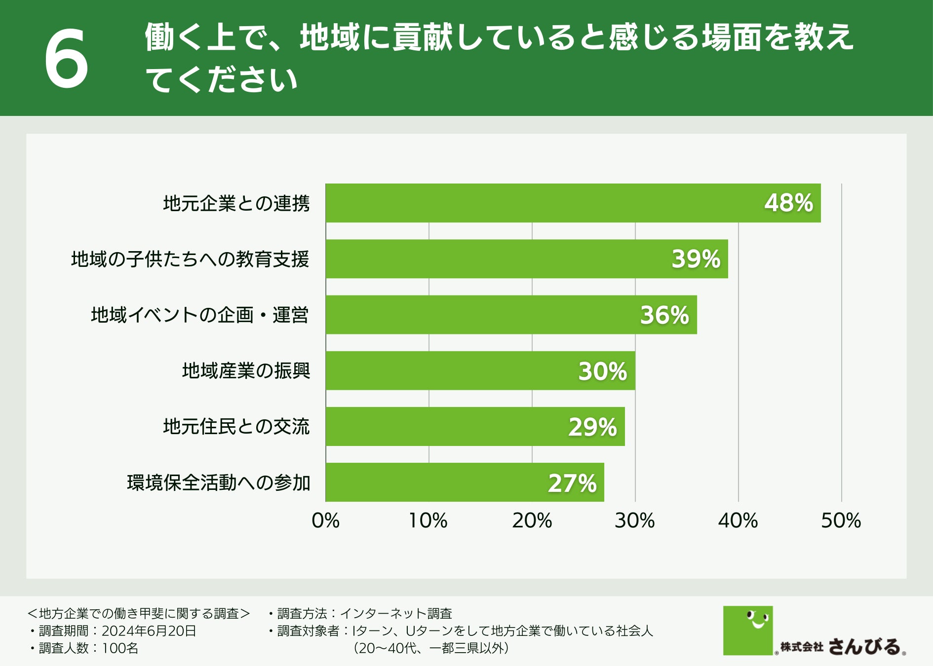 実際に、働く上で地域に貢献していると感じる場面について伺ったところ、「地元企業との連携(48.0%)」「地域の子供たちへの教育支援(39.0%)」「地域イベントの企画・運営(36.0%)」という回答が集まりました。