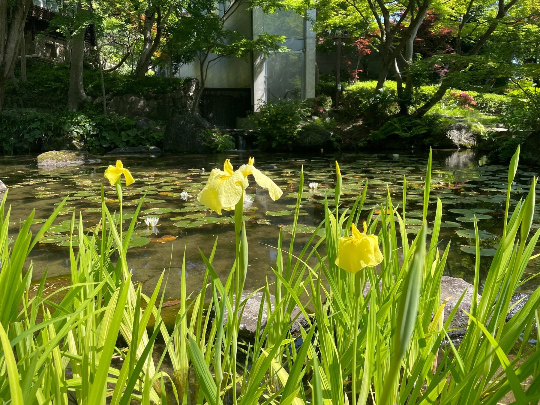 約5500坪の庭園には、数多くの植物が配され、春の桜や秋の紅葉など、四季折々の風景が広がります。5月頃からは眩しい新緑のなか、庭園の池ではさまざまな色のスイレンが開花し始めます。