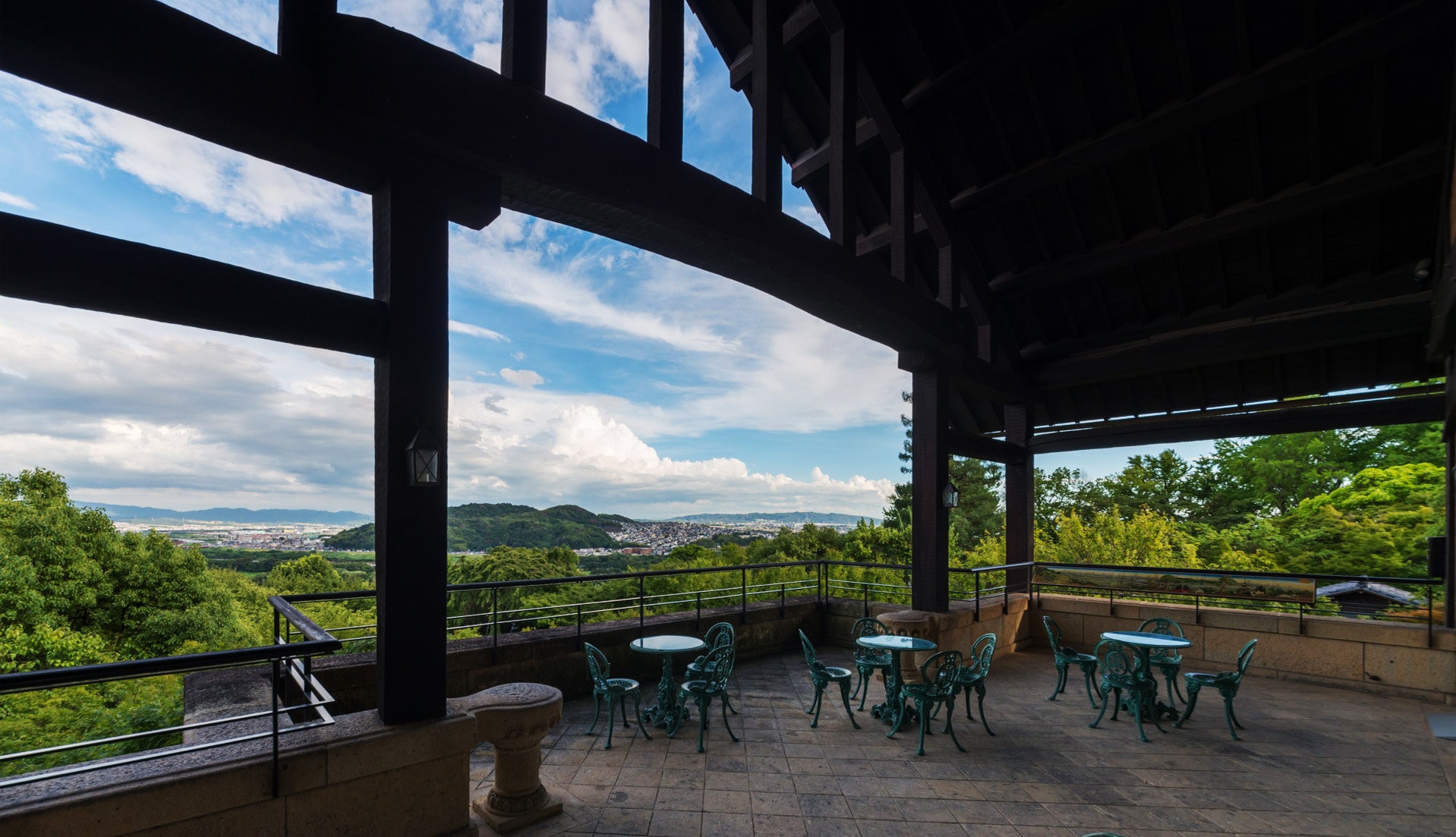 木津川・宇治川・桂川の三川合流も見ることができ、美術館庭園をはじめ、周辺の山々の景色を見渡すことができるのは、天王山の中腹に構える当館の喫茶室テラスならでは。