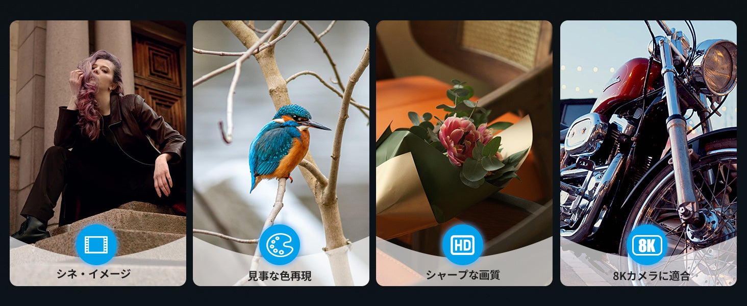 【並外れた画質】レンズ構造には、色収差を低減し、プロの映画撮影と見分けがつかないクリアで鮮やかな画像を保証するプレミアムコーティングが施された高品質のガラス要素があります。
