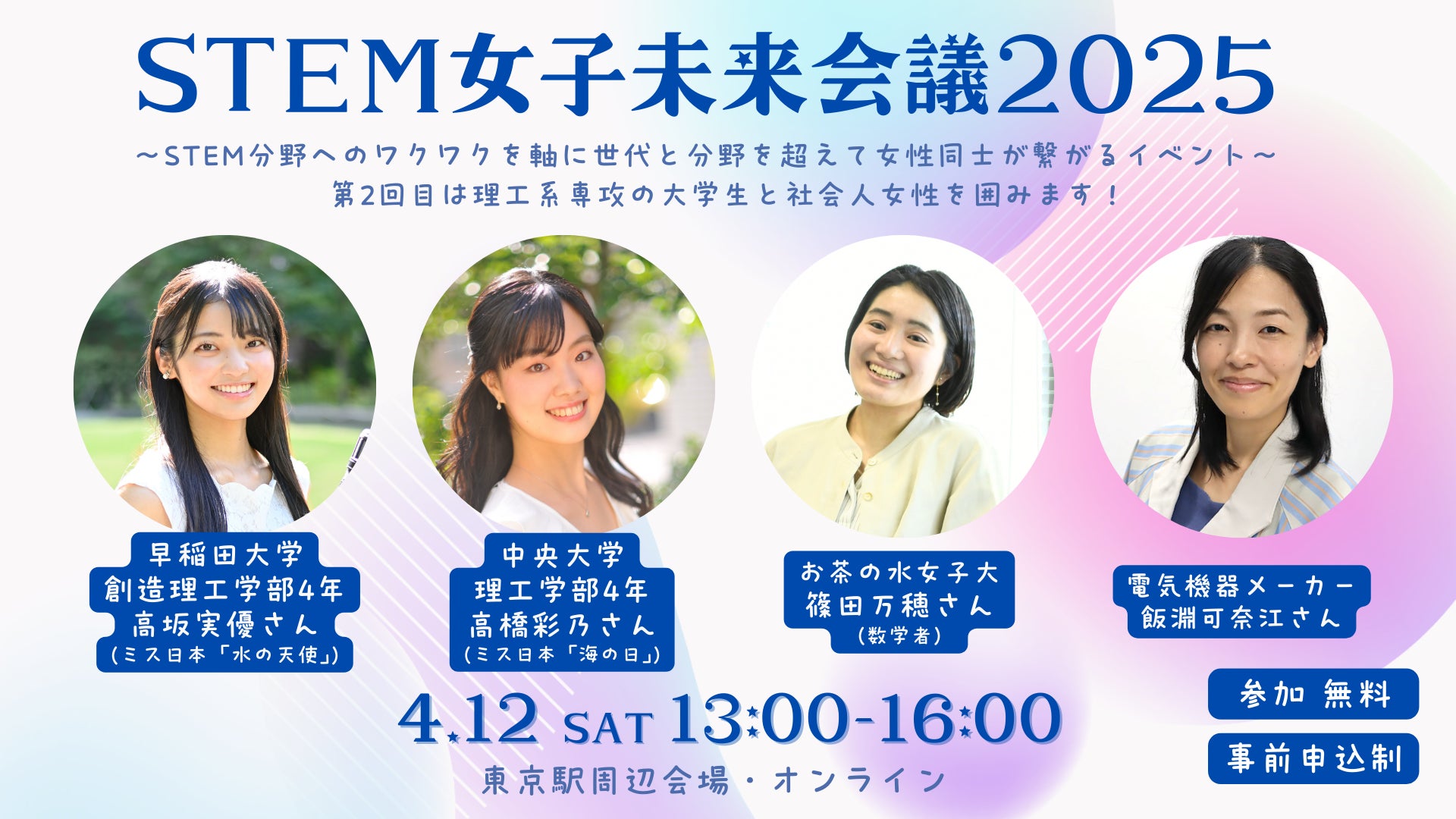 こういった課題を解決するため、本イベントでは、STEM分野を軸として女子高校生、女子大学生・大学院生および社会人女性が一同に会し、等身大でお話することによって、理工系女性の多様なキャリアの可能性と世代と所属を超えたつながりを生み出す場の提供を目指します。多くの皆さまのご参加をお待ちしています。
