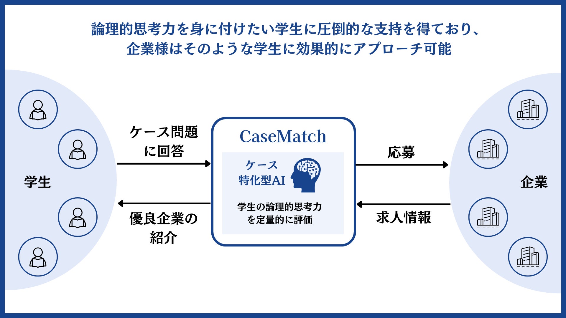 毎週開催のケースコンペをケース特化型AIが客観的に採点することで、学生側には一人では客観的な評価が難しいケース面接の練習の場を提供し、企業側には優秀な学生の母集団形成やスクリーニングなど、学生と企業それぞれの就職活動・採用を支援しています。