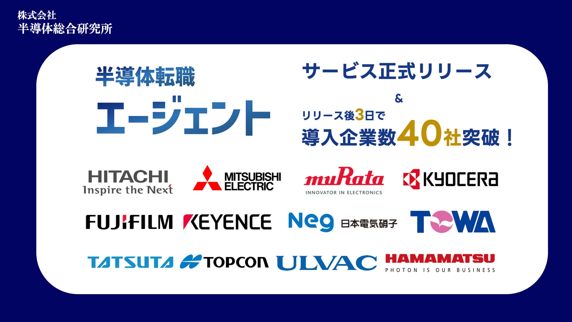 株式会社半導体総合研究所(本社:東京都中央区、代表取締役:猪狩佑晟、以下半導体総合研究所)は、有料職業紹介許認可を取得し、製造業界・半導体業界特化型転職サービス「半導体転職エージェント」を9/1に正式リリースいたしました。また、正式リリースから3日間で導入社数が40社を突破いたしました。