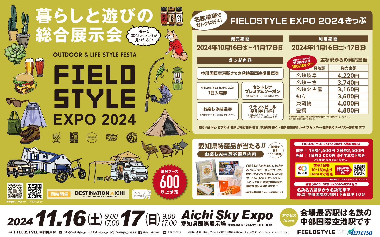 きっぷ内容:「中部国際空港駅までの名鉄電車往復乗車券」+「FIELDSTYLE EXPO 2024 1日入場券」+「愛知県特産品が当たる!お楽しみ抽選券」+「セントレアプレミアムクーポン」+「クラフトビール割引券(1杯)」