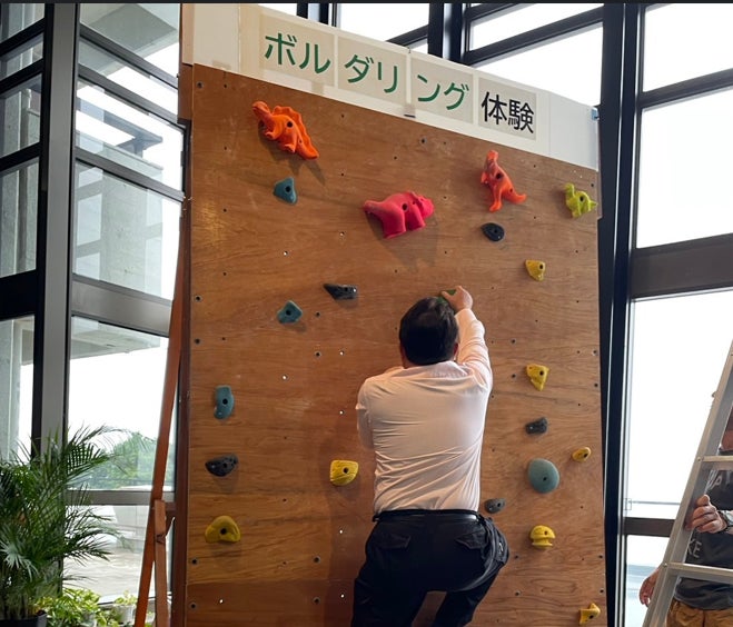 ボルダリング体験では実際に2m以上の壁に挑戦することが出来ます。学校の卒業生がスタッフとして携わっています。