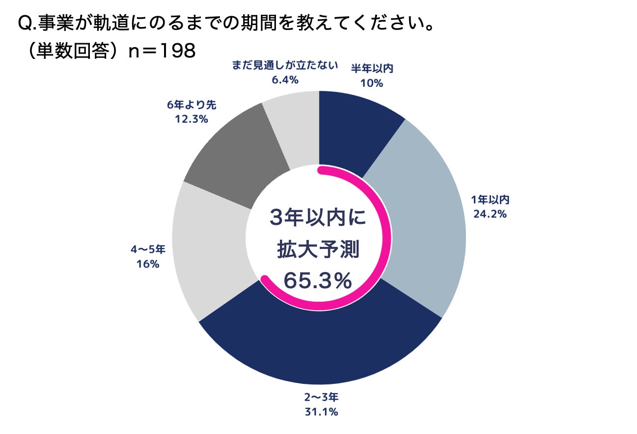 また、事業が軌道にのる見通予測は「半年以内(10.0%)」「1年以内(24.2%)」「2〜3年(31.1%)」と6割以上が3年以内の拡大を見据えている。