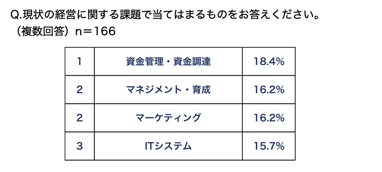 また、現在の経営課題については、「資金管理・資金調達(18.4%)」がトップ。ついで「マネジメント・育成(16.2%) 」 「マーケティング(16.2%) 」があがる。