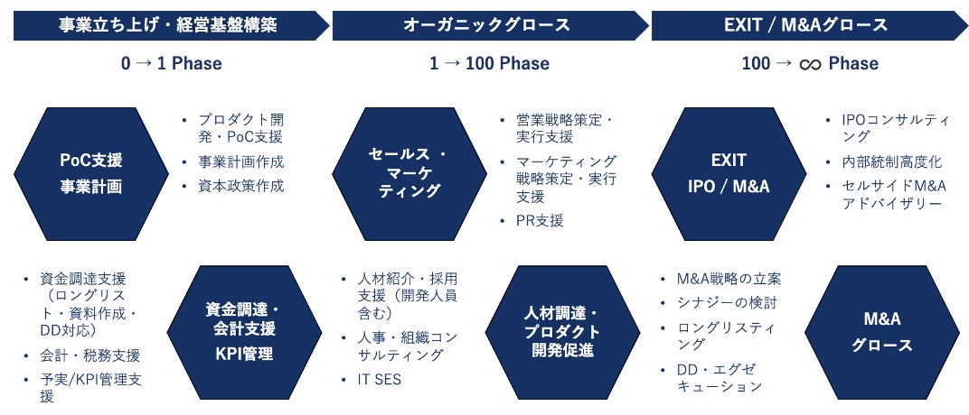 事業立ち上げ・経営基盤構築から、オーガニックグロース、EXIT/M&Aグロースまでシームレスに支援