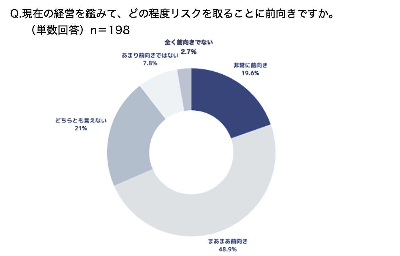 経営におけるリスクへの向き合い方について、「非常に前向き(19.6%)」は2割程度にとどまる。