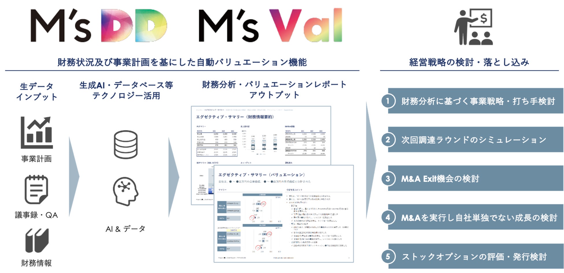 財務状況及び事業計画を基にした自動バリュエーション機能を活用し、定期的に企業価値をチェックすることで、事業戦略・打ち手検討から資金調達シュミレーション、M&A等の検討、ストックオプション評価まであらゆる経営戦略策定をサポートします。