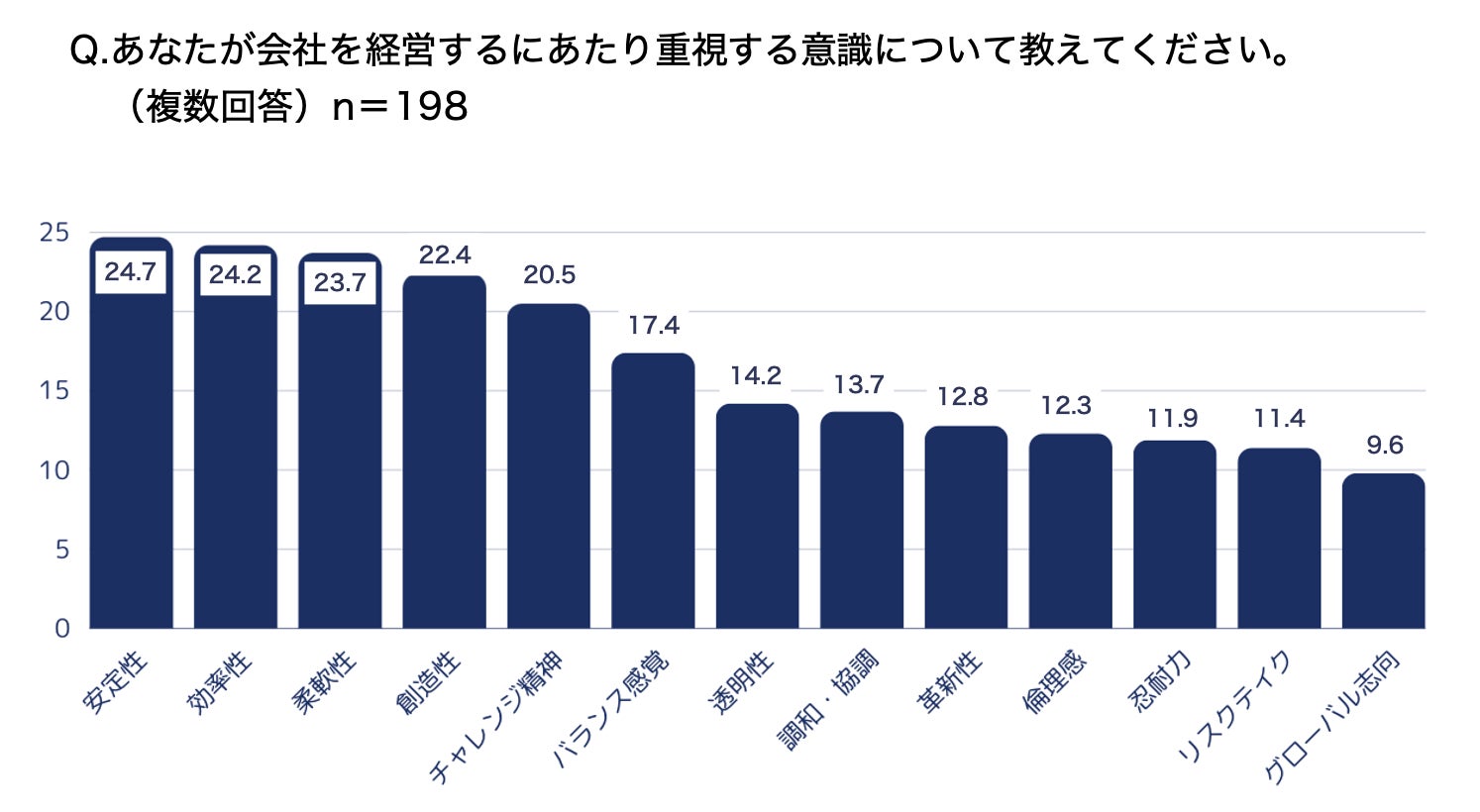 経営で重視する点においては、「安定性(24.7%)」がトップ。「リスクテイク(11.4%)」「グローバル志向(9.6%)」は相対的に低い結果に。