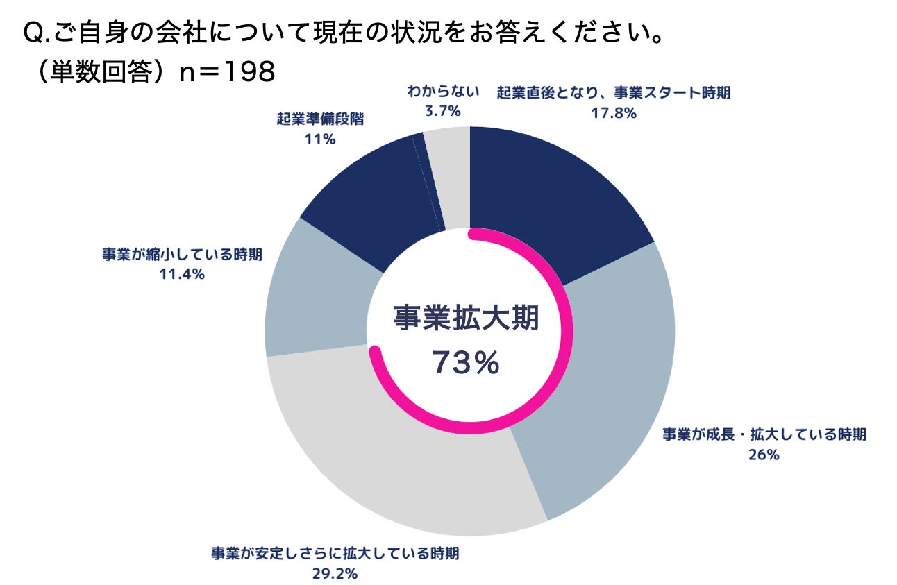 現在の会社の状況は「起業直後、事業スタート時期」が17.8%、「事業が成長・拡大している時期」26.0%、「事業が安定し、さらに拡大している時期」29.2%と、7割以上が事業拡大期。