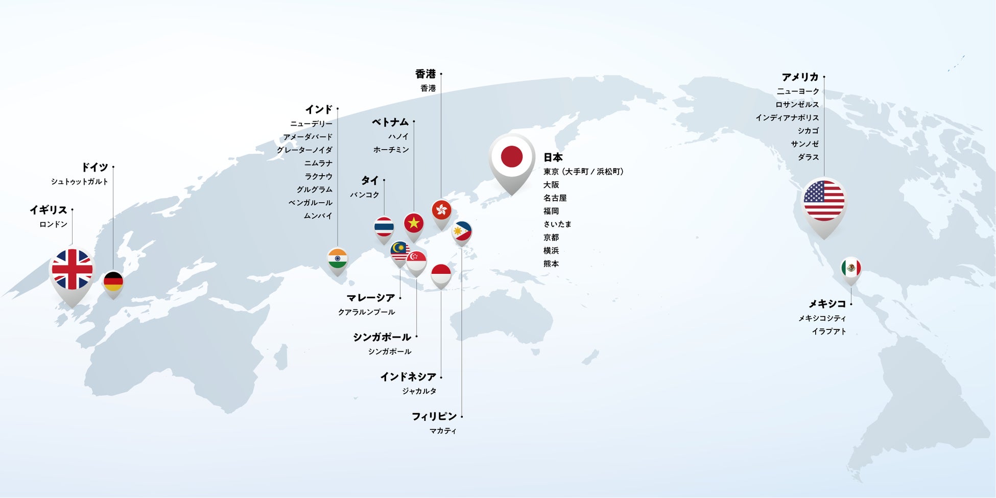いわゆる欧米系のグローバルネットワークとは一線を画し、日系企業特有の商習慣やニーズにきめ細やかに対応しながら、クライアントの皆様の国際事業を支援しています。今後も対応可能なエリアを拡大し、良質なサービスをご提供しながら、世界で最も信頼されるグローバルネットワークとなることを目指します。