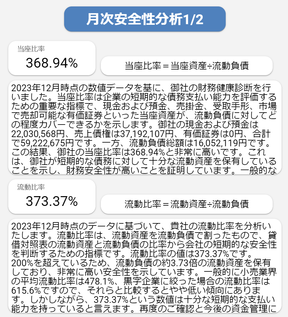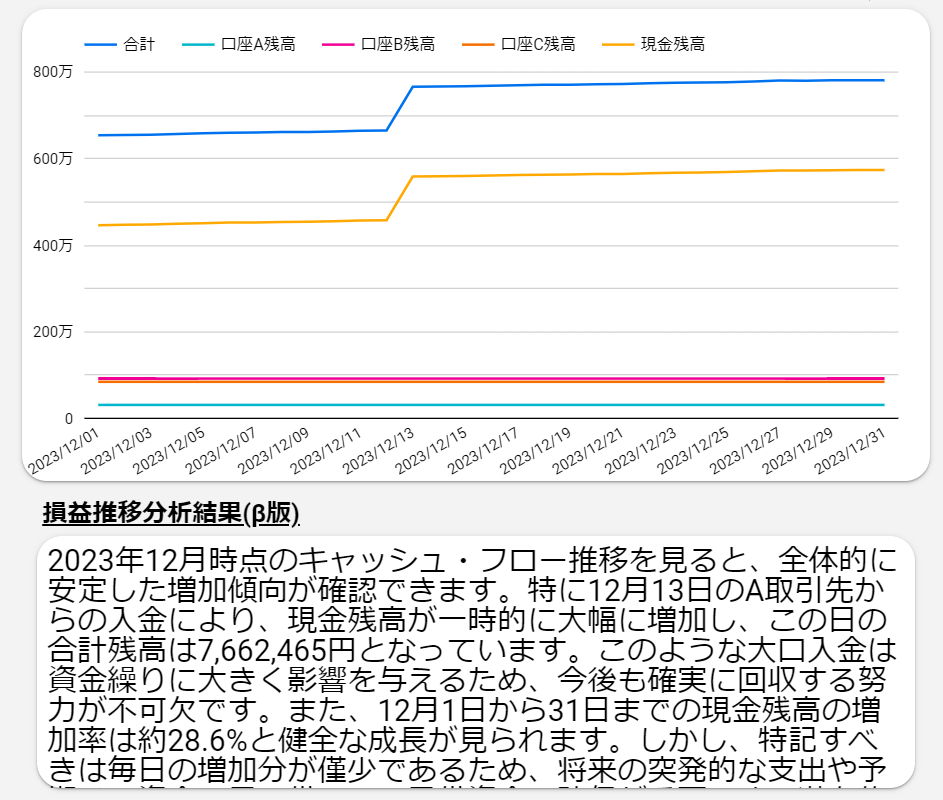 ・経営状況のリアルタイムコメント生成: 財務指標の変動や傾向について、会計税務の専門家がコメントを作成します。