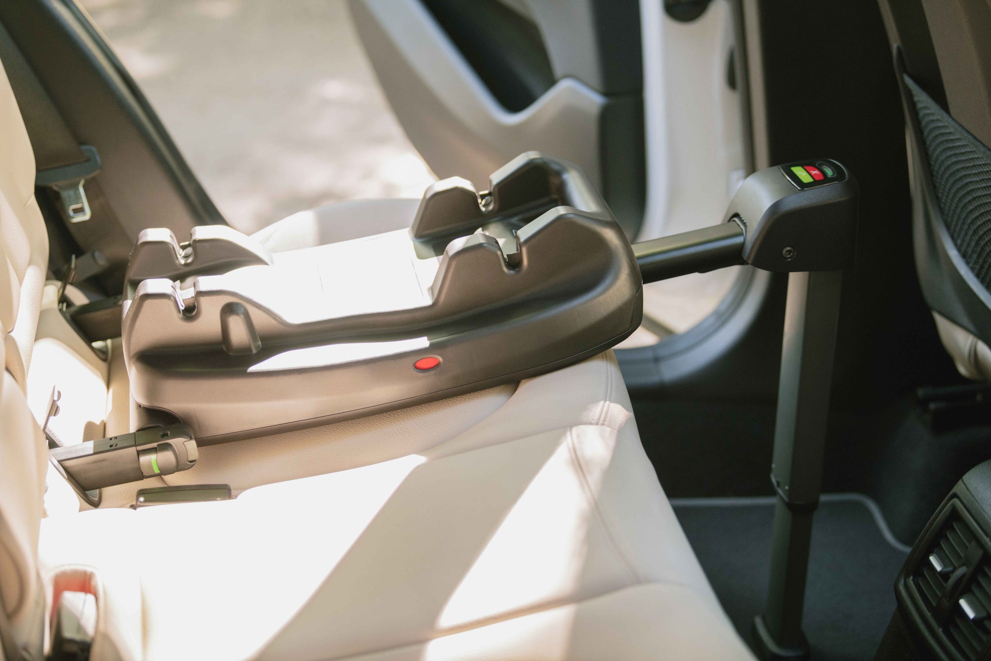 ベースは⾞両のアンカーバーに安全で簡単に取り付けることがでるISO fix を採⽤してます。正しい取付が完了すると、インジケーターが⾚⾊から緑に変更します。サポートレッグが衝撃をさらに吸収します。