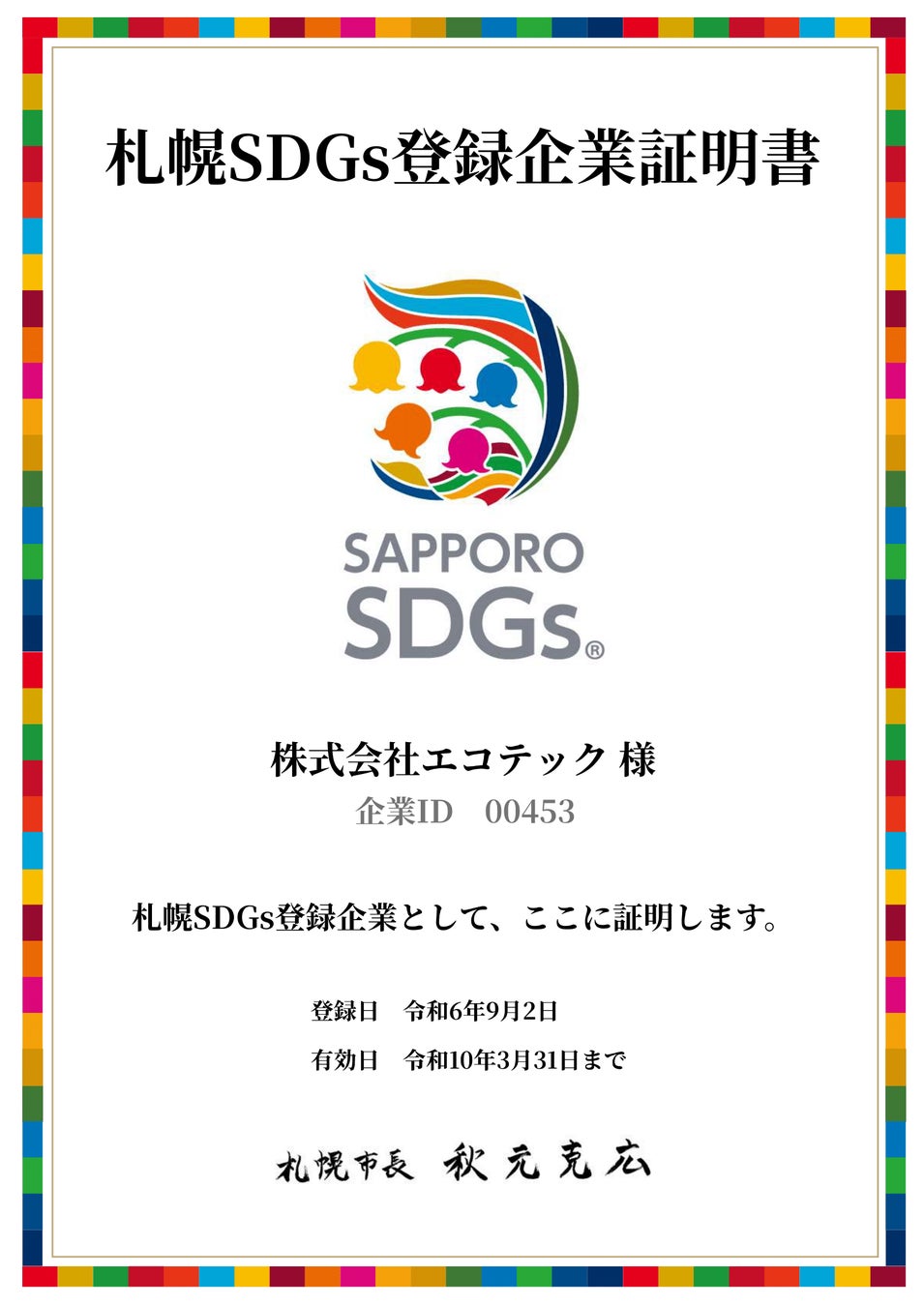 株式会社エコテック(本社所在地:北海道札幌市東区北37条東15丁目1‐1 代表取締役 今 雅教)は、「札幌SDGs企業登録制度」に事業者登録されました。