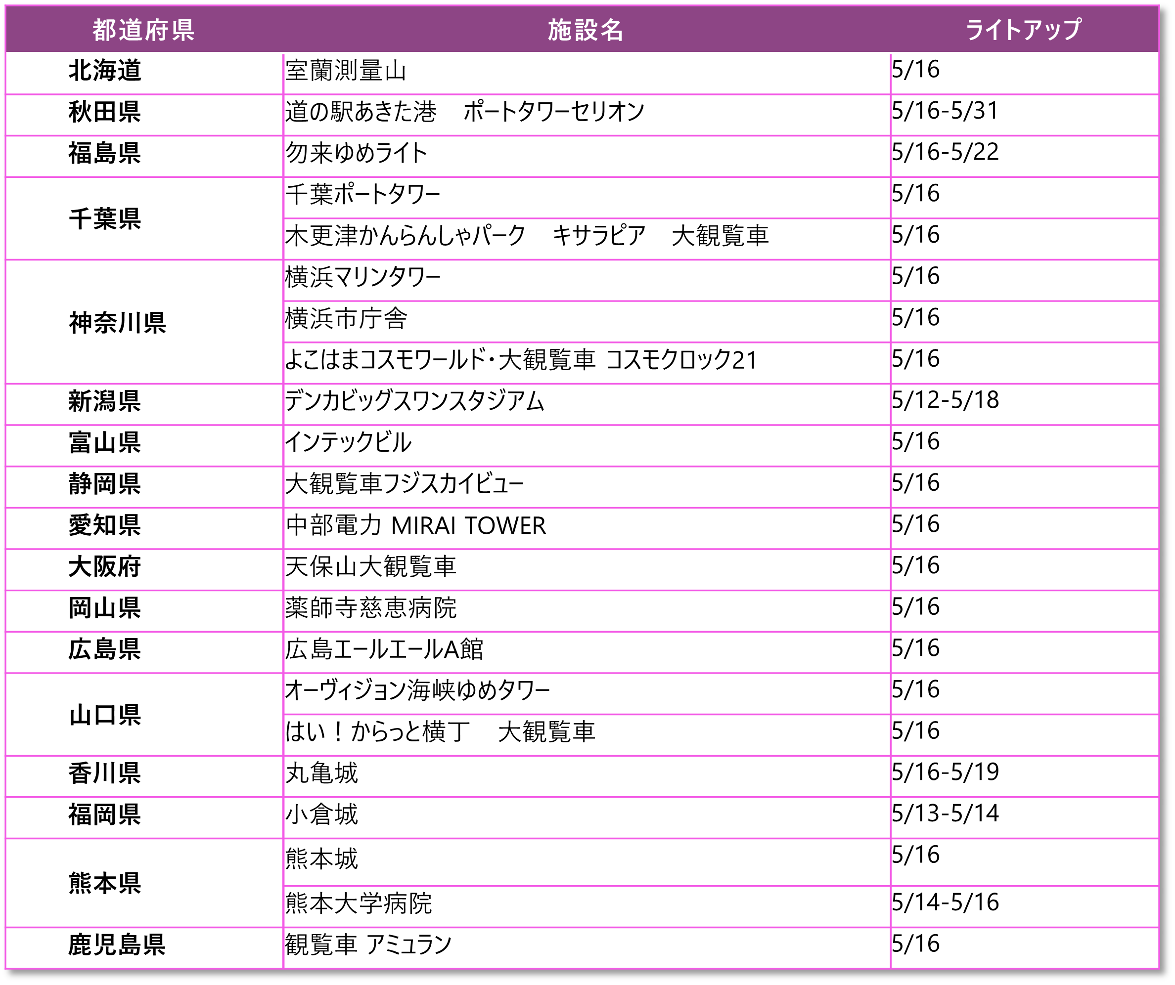 日付:2024年5月16日を含む下記期間 ※一部施設は日程が異なりますのでご注意ください。