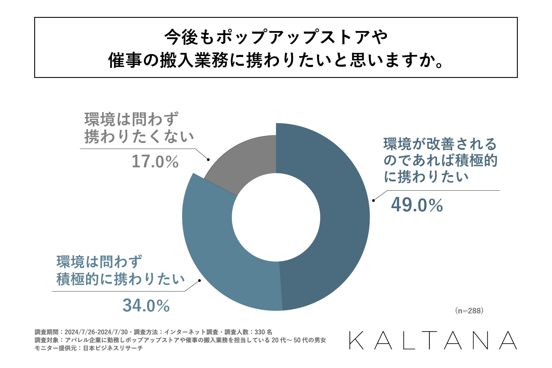 調査の最後に「今後もポップアップストアや催事の搬入業務に携わりたいと思うか」を問う設問の回答では、1位が「環境が改善されるのであれば積極的に携わりたい」で49.0%、2位が「環境は問わず積極的に携わりたい」で34.0%となりました。総じてポップアップストアや催事の業務を前向きにとらえている方が多いとわかりましたが、約半数の方は、ポップアップストアや催事の搬入業務を続ける上で、労働環境の改善を求めている、という事実が明らかになりました。
