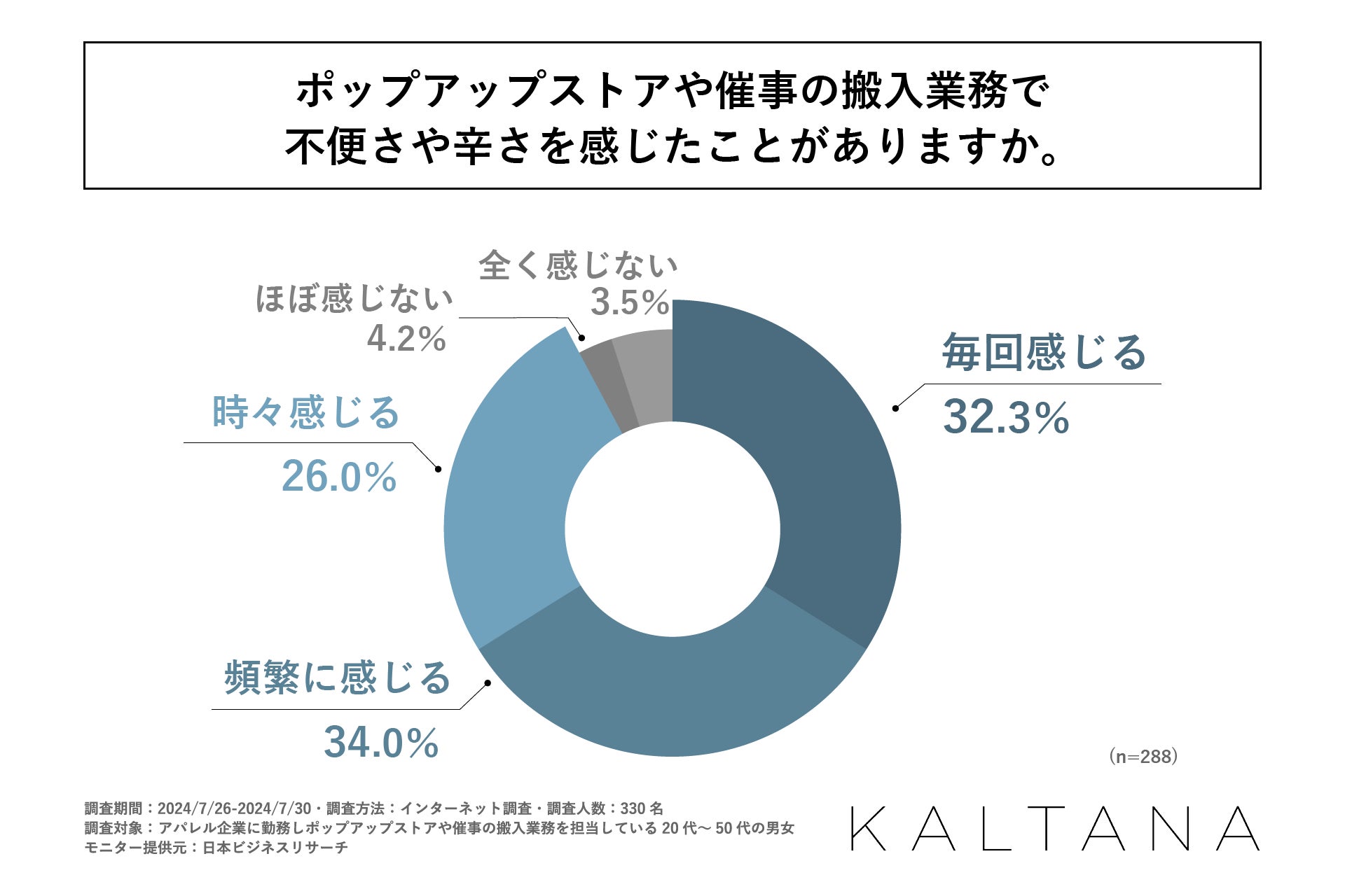コロナ禍を経てECやD to C(Direct to Consumer)は活況を呈しています。一方、商品を消費者へ直接アピールできるポップアップストアや催事も活気を取り戻しつつあり、連日商業施設等では、アパレル関係のポップアップストアや催事が行われています。商品の展示等には什器が必要ですが、こうした物の運搬作業は女性やシニアにとっては重労働になります。また、業務負荷の高い仕事は一般的に嫌われる傾向にあり、離職にもつながり得ます。働き方改革が叫ばれる時代、人の稼働に関してもより生産性の向上が求められています。そこで軽さと堅牢性を備えたアルミ製棚台車『KALTANA(カルタナ)』の製造・販売を行う岩谷マテリアルは、アパレル企業に勤務しポップアップストアや催事を担当されている20代~50代の会社員の方を対象に「アパレル業界のポップアップストアや催事の搬入業務における変化」に関する調査を実施しました。