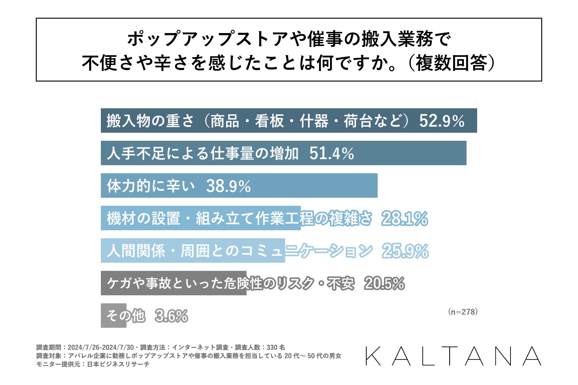 次に、頻度を問わず、ポップアップストアや催事の搬入業務で不便さや辛さを感じたことがあると回答された方に「ポップアップストアや催事の搬入業務で不便さや辛さを感じたことは何か」を尋ねる設問の回答では1位が「搬入物の重さ(商品・看板・什器・荷台など)」で52.9%、2位は「人手不足による仕事量の増加」で51.4%、3位が「体力的に辛い」で38.9%となりました。この結果から重い搬入物を移動、少人数での作業に特に不便さや辛さを感じている方が多いという状況が判明しました。