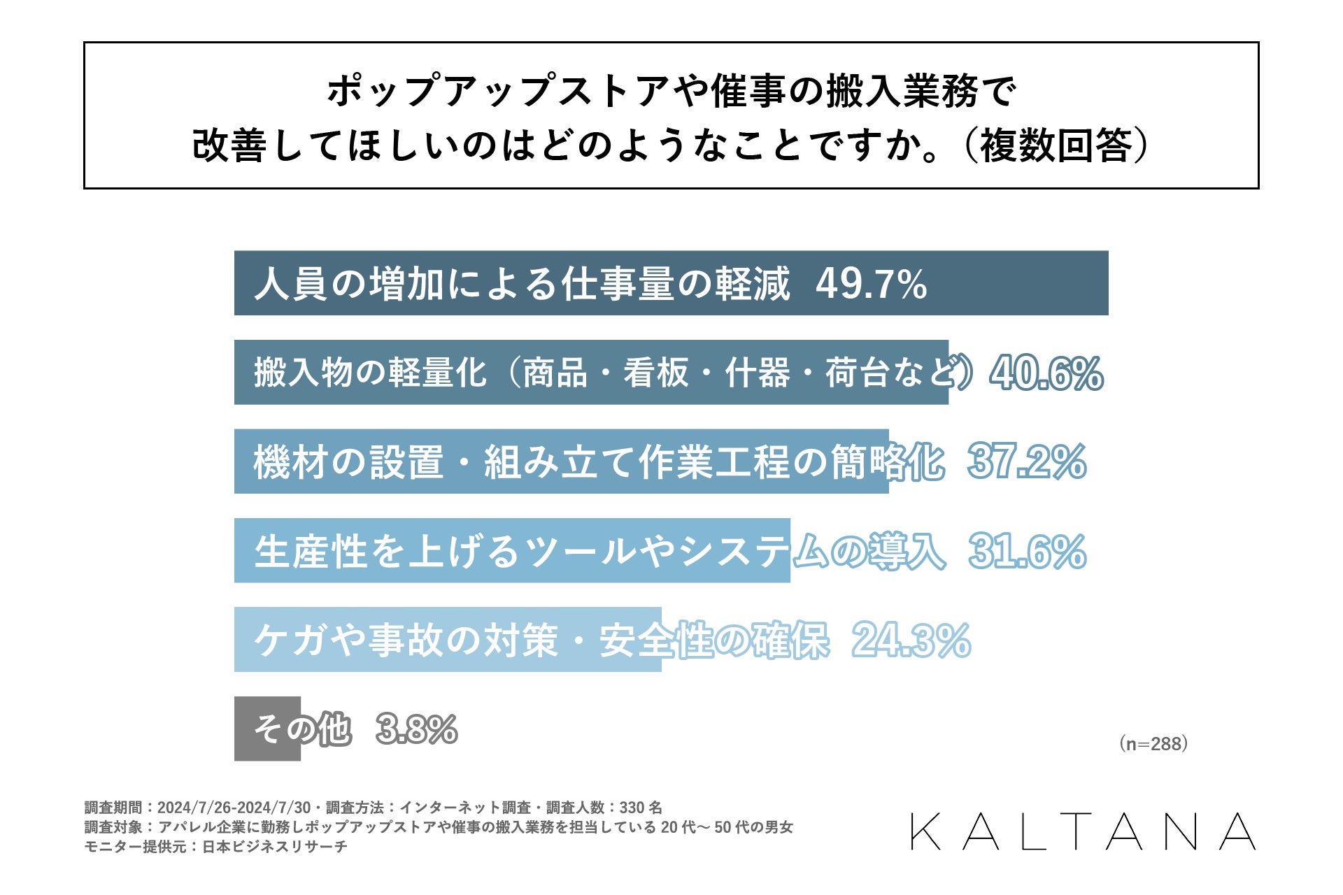 続いて「ポップアップストアや催事の搬入業務で改善してほしいのはどのようなことか」を尋ねる設問への回答では1位「人員の増加による仕事量の軽減」で49.7%、2位「搬入物の軽量化(商品・看板・什器・荷台など)」で40.6%、3位「機材の設置・組み立て作業工程の簡略化」で37.2%、4位「生産性を上げるためのシステムやツールの導入」で31.6%となりました。過去の設問で訊いた「ポップアップストアや催事の搬入業務で不便さや辛さを感じること」を解消するような内容の回答が上位に並ぶ結果となりました。