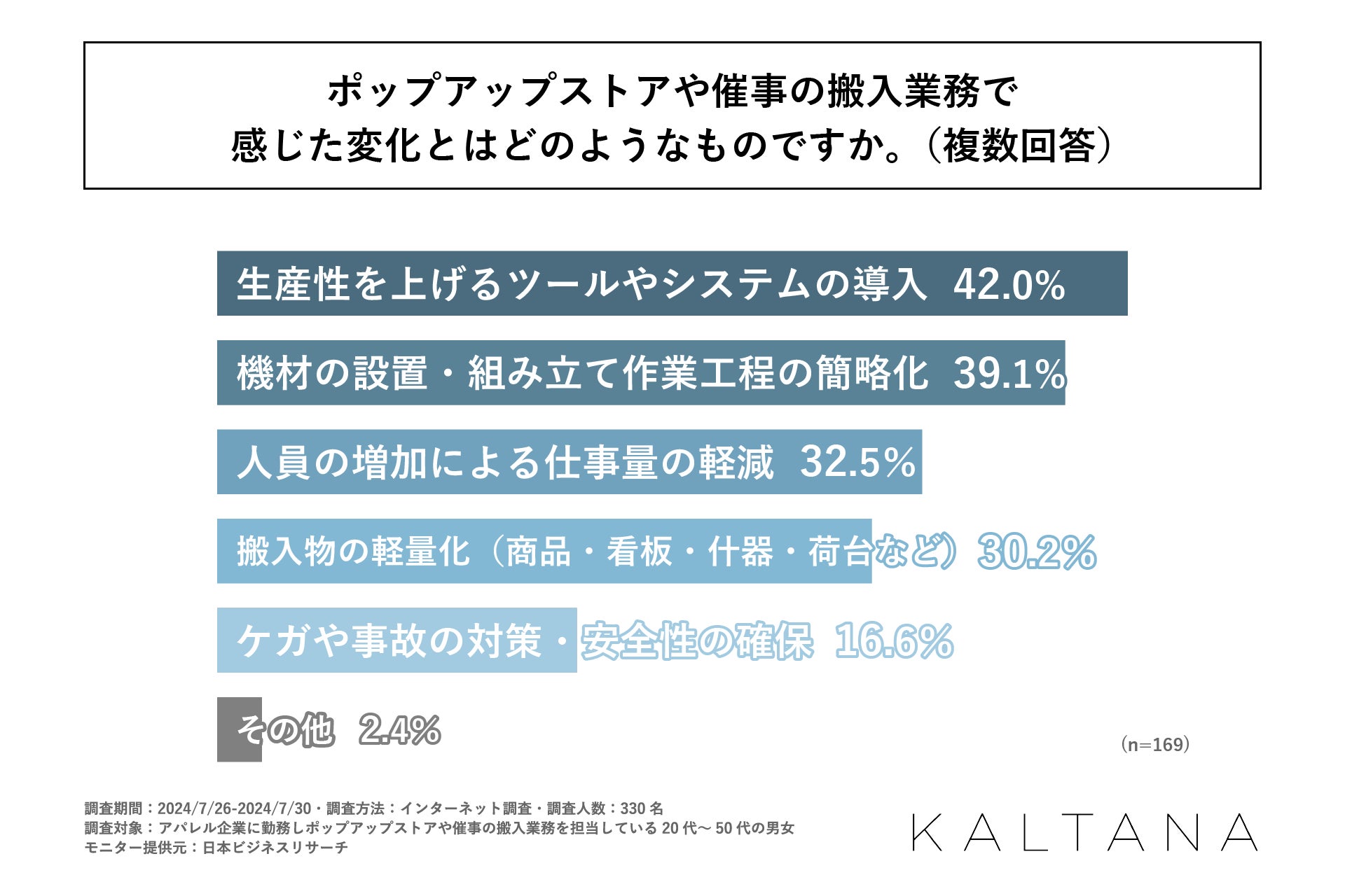 また、「ポップアップストアや催事の搬入業務で感じた変化とはどのようなものか」を尋ねる設問の回答で多かったのは、1位が「生産性を上げるツールやシステムの導入」で42.0%、2位が「機材の設置・組み立て作業工程の簡略化」で39.1%となりました。この結果から、ポップアップストアや催事の搬入業務においては「生産性を上げるツールやシステムの導入」を最も多くの方が変化として感じていることがわかりました。