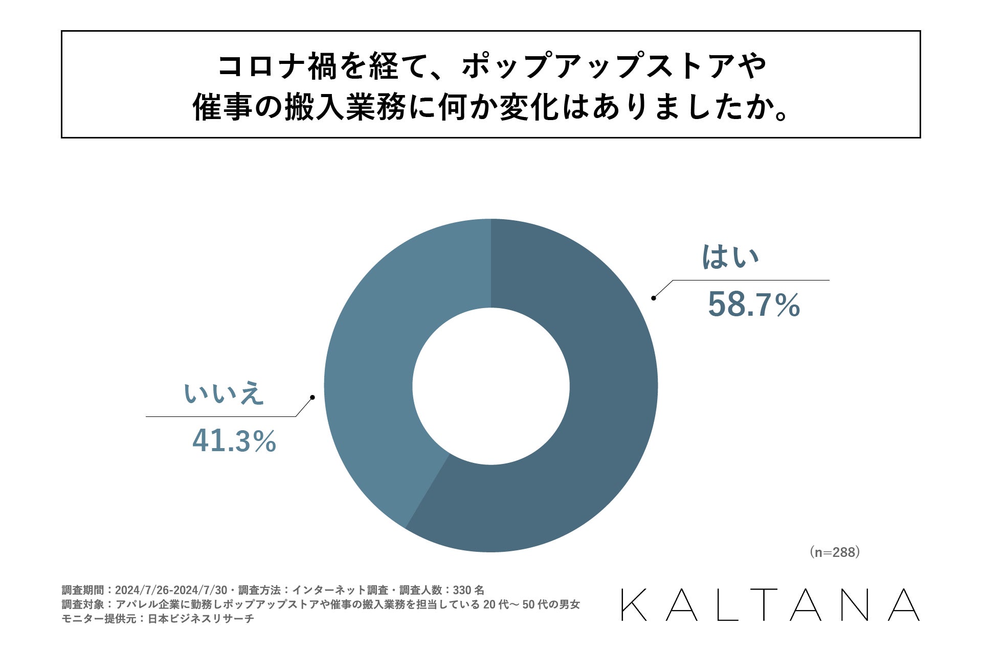 続いて「コロナ禍を経て、ポップアップストアや催事の搬入業務に何か変化はあったか」を問う設問への回答では、「はい」が58.7%と過半数を占める形となりました。コロナ禍を経て、ポップアップストアや催事の搬入業務に何らか変化を感じている方が多いとわかりました。