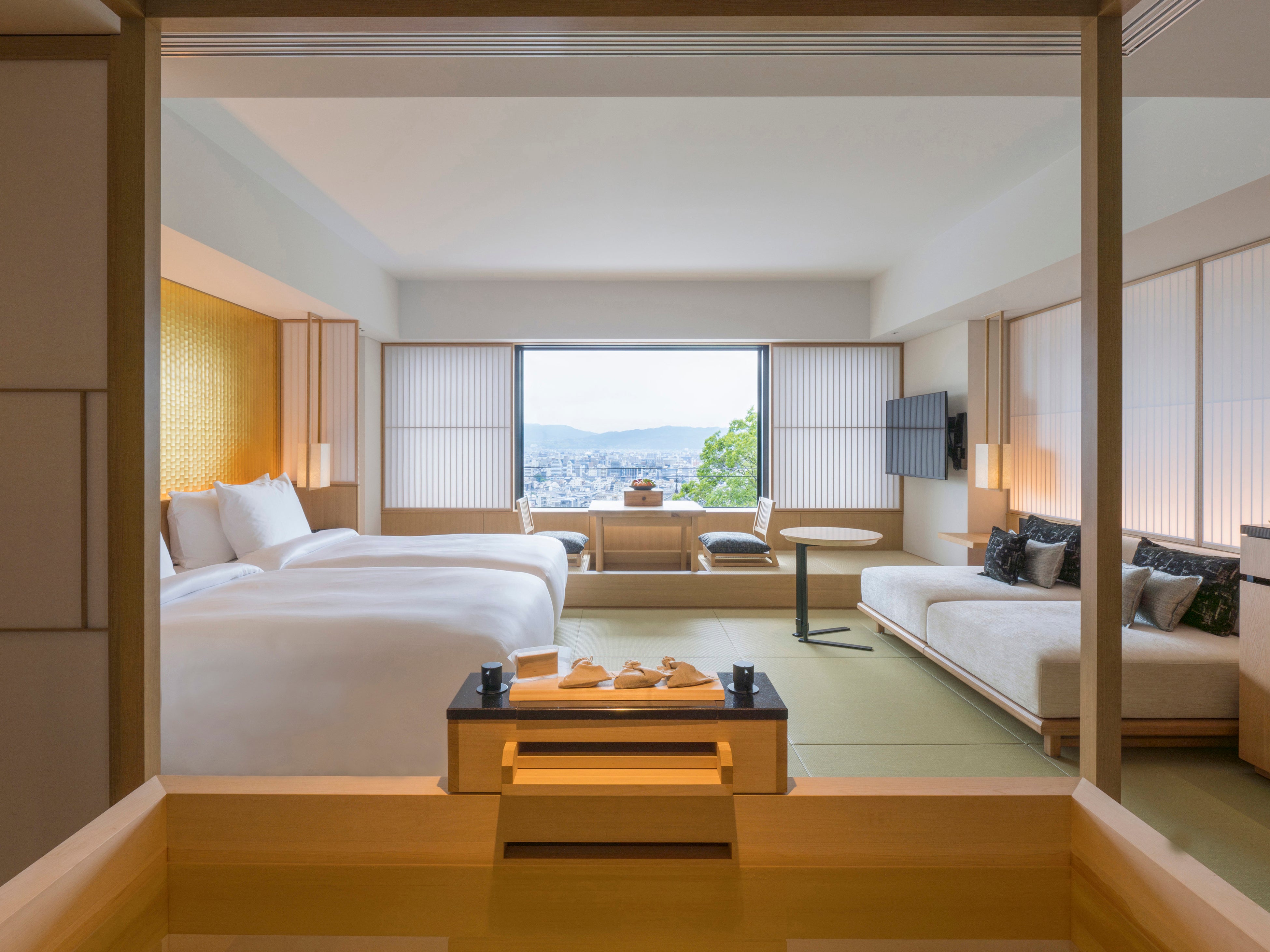 インテリアデザイナー・橋本夕紀夫氏がデザインした客室は、日本の伝統的な技法とモダンでナチュラルな要素を融合させ、大きなヒバの木のバスタブ、畳、天然木、金箔のアクセントなど、五感を刺激し、比類なきサンクチュアリをご提供します。客室タイプには、京都市街のパノラマビューが楽しめるお部屋や 、プライベート温泉付きで小庭園や青々と茂る竹林、能舞台を見渡せる「ONSENリトリート」などがあります。