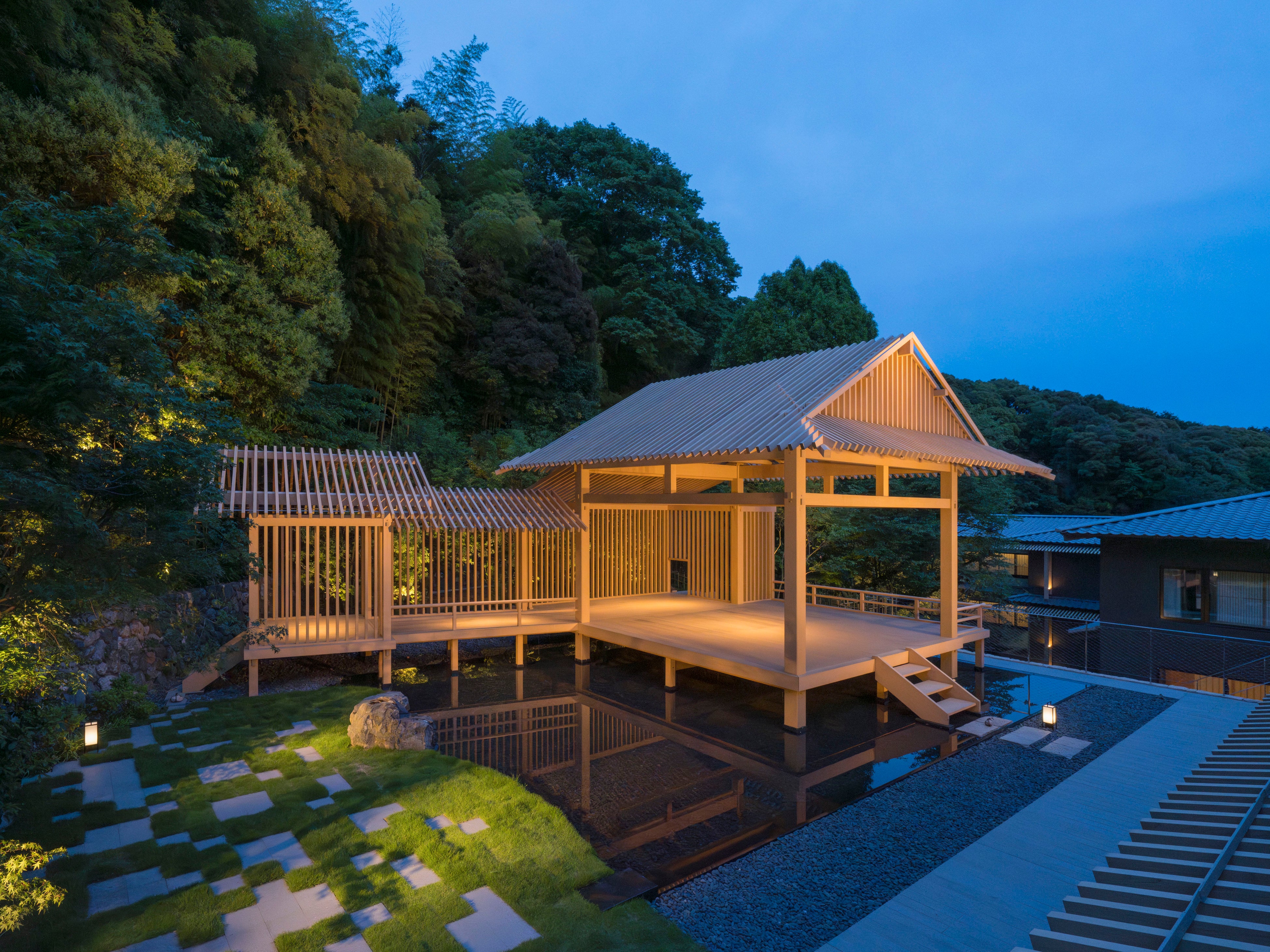 世界的建築家、隈研吾氏をマスターアーキテクトに迎えたバンヤンツリー・東山 京都の建築は、周囲の豊かな自然とシームレスに融合し、日本の伝統的な建築技術を取り入れながら、現代的な要素も取り入れることで、東山の景観と見事に調和した建築となっています。ヒノキなどの天然木材をふんだんに活用した美しいホテルのファサードは、この地域が持つ時代を超えた魅力を引き立てます。大きな窓と開放的な空間は、周囲の山々や緑豊かな庭園の静謐な美しさを室内に優しく導くよう計算され、幽玄で非日常的な隠れ家を作り出しています。京都の職人が庭園と竹林を再生し、生物多様性を高めるとともに、歴史ある日本庭園の伝統技術を反映させています。
