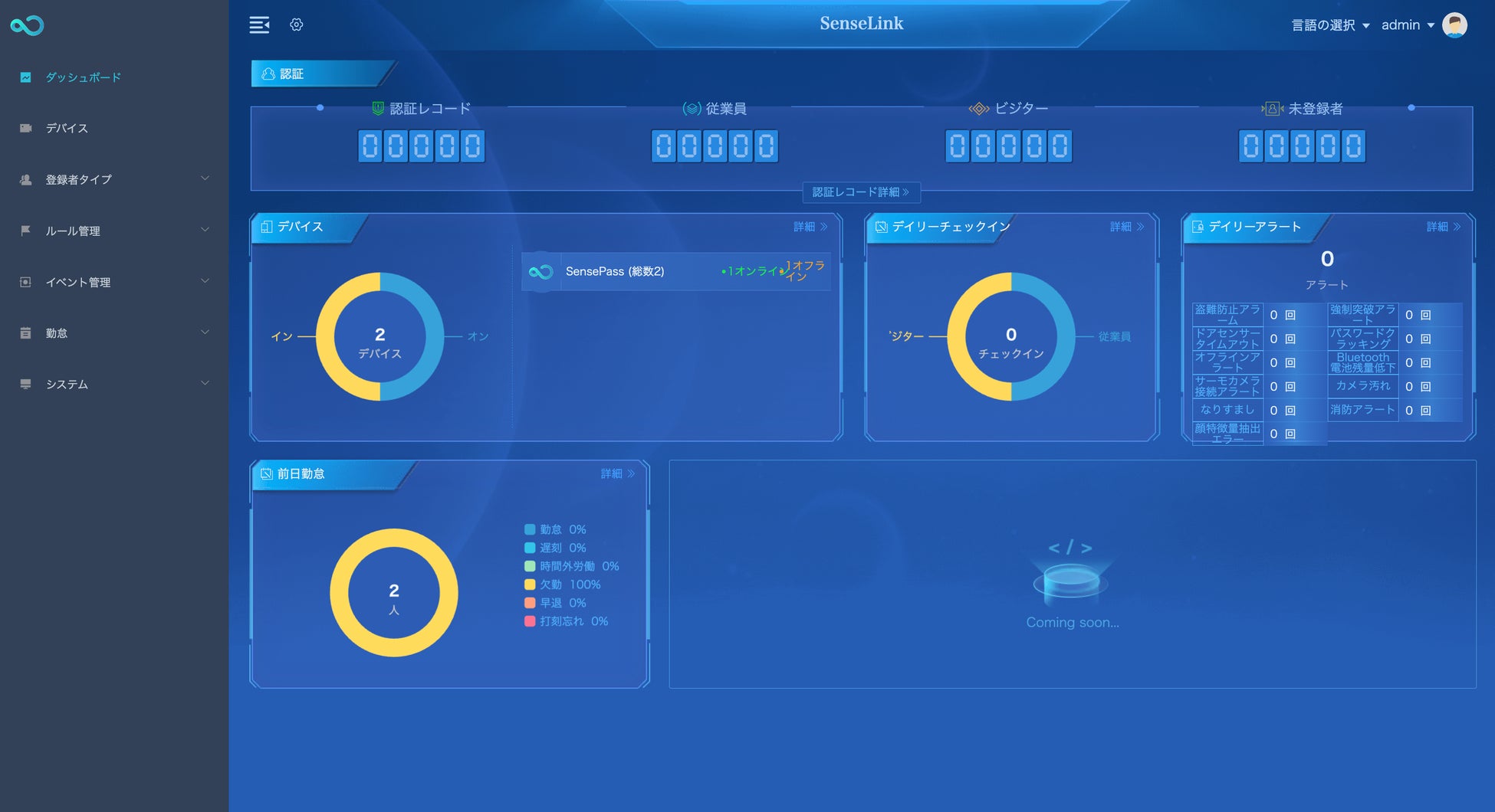 顔認証デバイスSensePassとあわせてご利用いただける顔認証アクセス管理ソフトウェア。ダッシュボード機能など視覚的にわかりやすいUIで、デバイスやユーザ権限、認証履歴の管理が可能です。