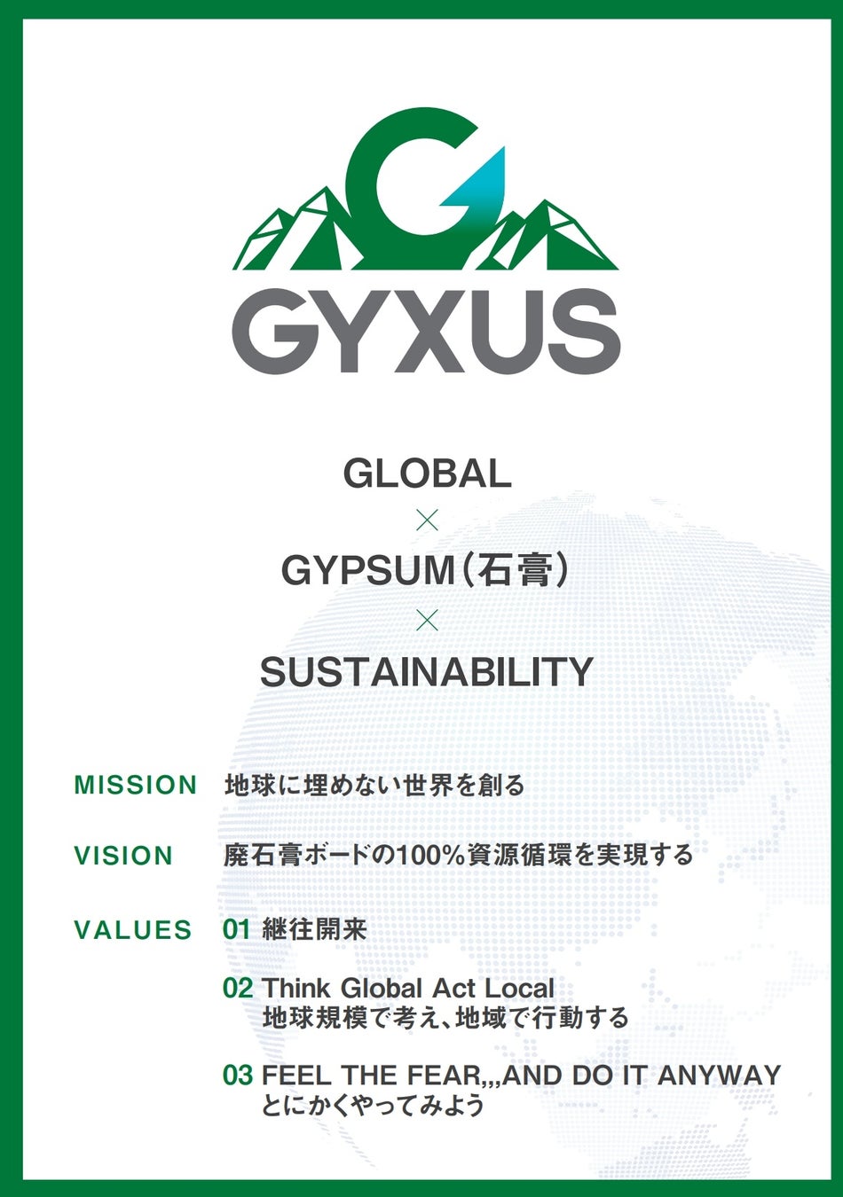 GYXUSは、いまだ世界中で埋められている廃石膏ボードを100%原料として石膏ボード製品を生産する水平リサイクル技術を核とし、他にも廃石膏ボードの性状や地域特性を踏まえた技術を開発しています。