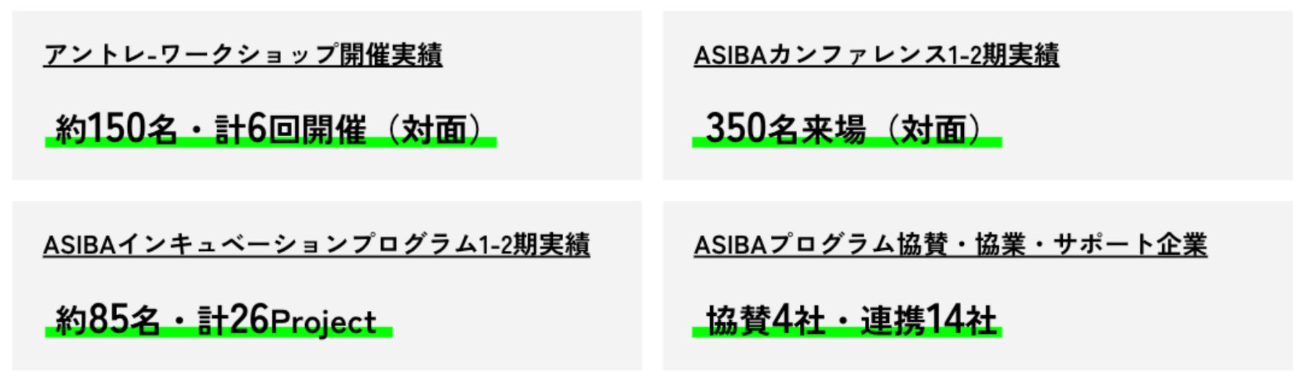 一般社団法人ASIBAは、建築・都市領域における日本初の学生向けインキュベーションプログラムとして、アイデア創出からプロトタイプ構築支援、業界大手企業との連携、建築×アントレプレナーシップコミュニティの立ち上げなどを行ってまいりました。建築・都市領域の14の大学から、85名の学生が参加するASIBAインキュベーションプログラムでは、建築分野の内側に閉ざされていた都市へのビジョンやプロダクトアイデアがアントレプレナーシップの精神と出会うことでその境界線を越え、シードプロジェクトとして社会実装への第一歩を踏み出しています。既存のスタートアップにはない独自の視点や世界観で描き出されるプロジェクト群は、スタートアップの裾野拡大・多様化に貢献しています。