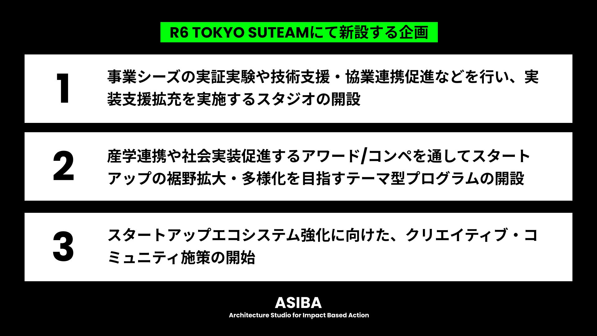 本協定事業においてASIBAは、これまでの事業知見を生かし、さらなる事業シーズの実証実験や技術支援・協業連携促進などを行い、実装支援拡充を実施するスタジオ形式の取り組み産学連携プログラムやデザイン実装コンペを通してスタートアップの裾野拡大・多様化を行う実践企画プログラム、スタートアップエコシステム強化に向けたクリエイティブ・コミュニティ構築を目指すコミュニティ創出プログラムからなる3つのプログラムを新設いたします。