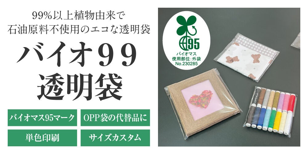 99%以上植物由来の「バイオ99透明袋」を新商品として発表。バイオ95取得済みでサーマルプリンタで印刷したり、サイズのカスタムも可能。商品の外装袋として使用されるOPP袋の代替品として期待できる。
