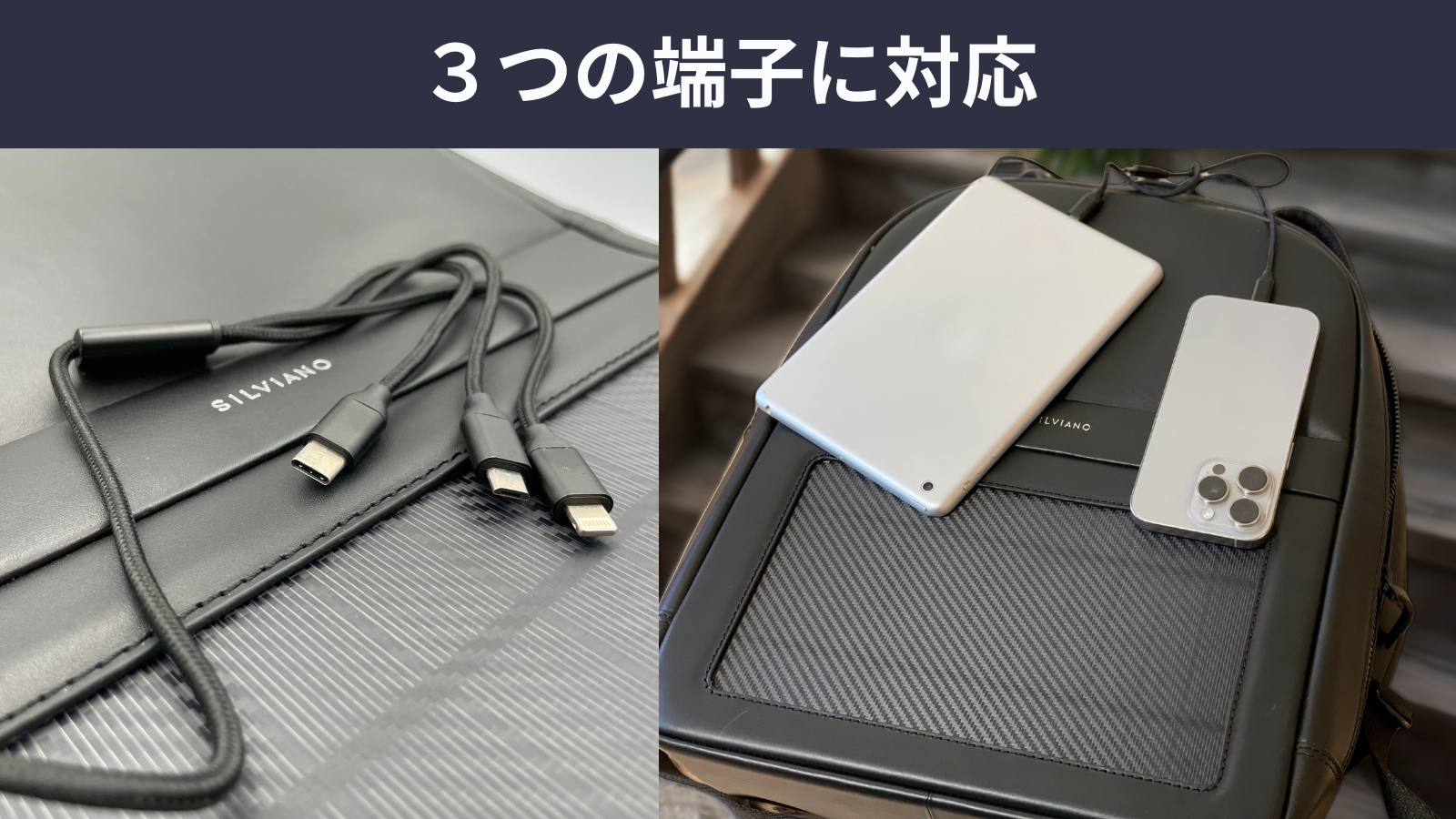 Lightning、Micro-USB、USB Type-Cの3種類の端子に対応しており、あらゆるデバイスの充電が可能。iPhoneやAndroidスマートフォン、タブレット、ワイヤレスイヤホン、モバイルバッテリーなど、現代のビジネスパーソンが持ち歩くデバイスを一括でサポート。外出先で「充電ケーブルが合わない…」といった心配がなく、急なバッテリー切れのトラブルも回避できます。さらに、バッグ内部に設置された配線スペースにより、ケーブルが絡まりにくく、すっきりと収納可能。スマートな移動を実現します。