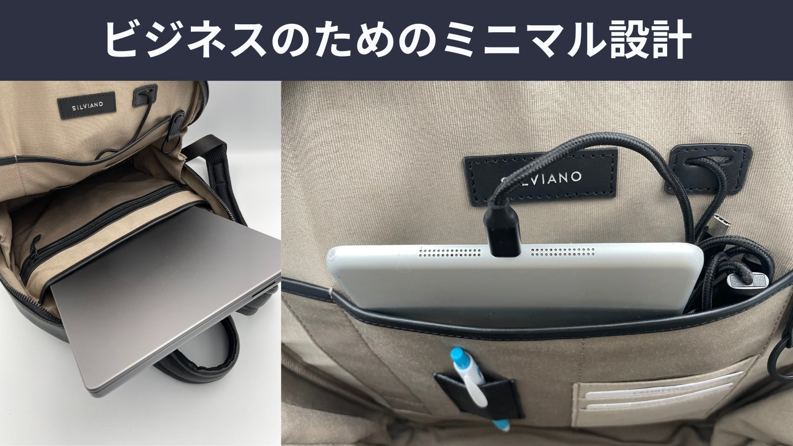 ノートパソコン専用ポケットをはじめ、A4サイズのドキュメントやタブレット、手帳、筆記用具、充電器、小物などを分類できる複数のコンパートメントを搭載。ミニマル設計でバッグの中で物が迷子になることなく、必要なアイテムをすぐに取り出せます。さらに、視認性を高める工夫が施された内部設計により、出し入れもスムーズ。