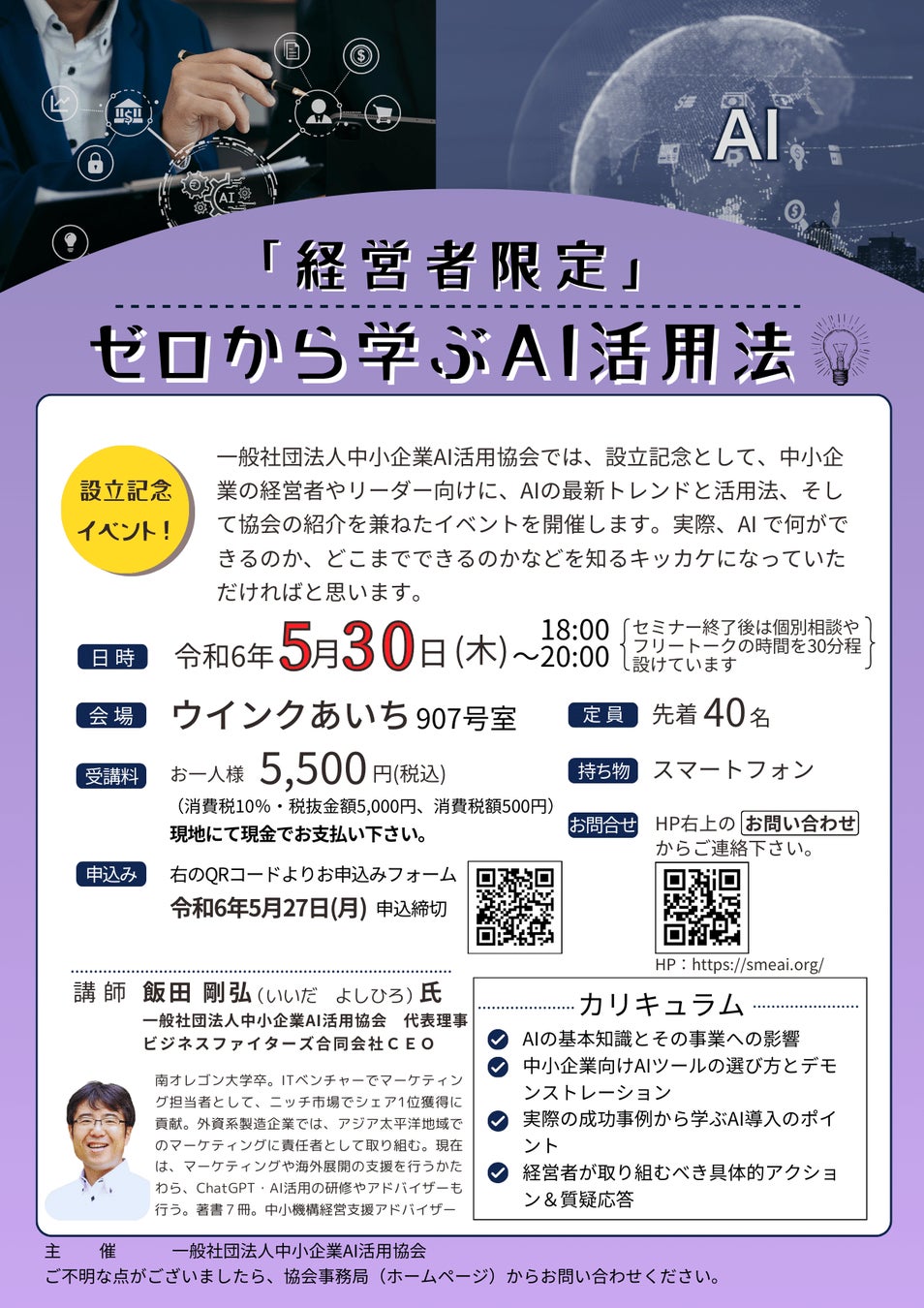中小企業のデジタル変革を加速し、持続可能な成長を支援するため、「一般社団法人中小企業AI活用協会」(所在地:愛知県、代表理事:飯田剛弘)を2024年4月に設立いたしました。経営者やビジネスリーダーが直面する課題を解決するため、AI活用に関する学びや交流の機会を通して、実践的な活用方法の普及に力を入れてまります。