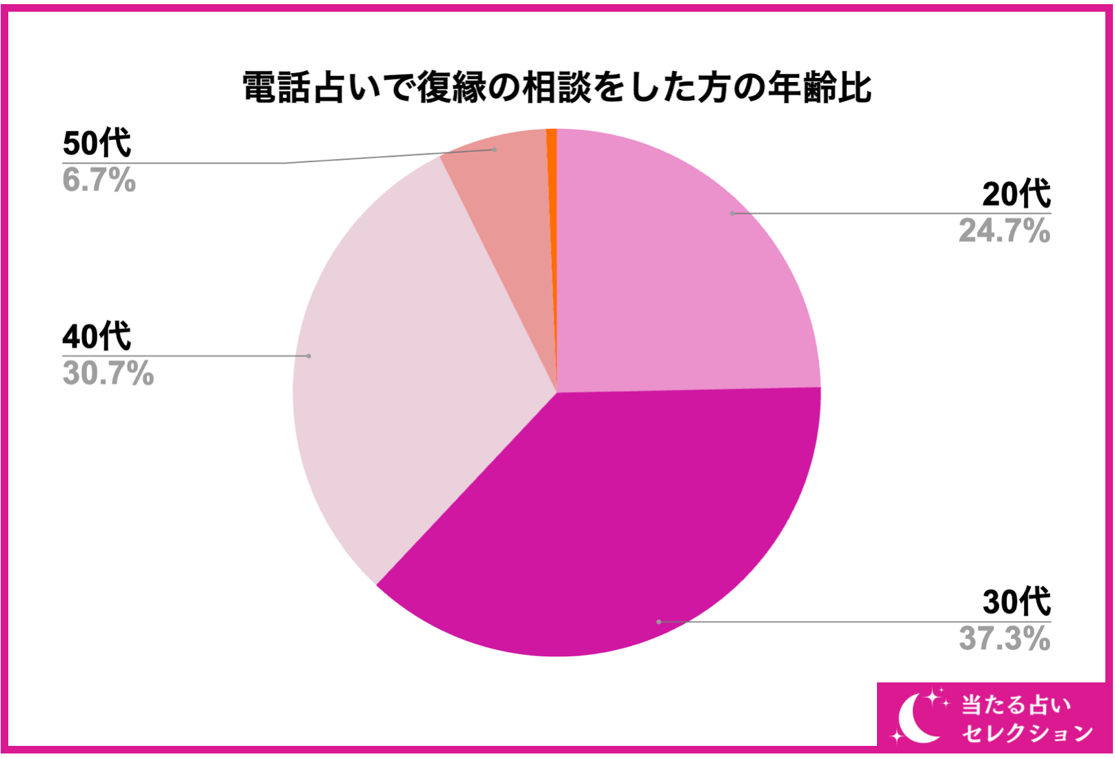 続いて電話占いで復縁を相談する方の年齢比率ですが、画像の通り、20代〜40代がメインとなっています。中でも、30代の利用者数が全体の37%とかなり多くなっています。30代になると使えるお金が多くなったり、この先の人生を考えた時にどうしても復縁をしたいと考えて占いを利用する方も増えているのかもしれませんね。一方で、50代を境に復縁の相談をする人が顕著に下がっている結果となりました。