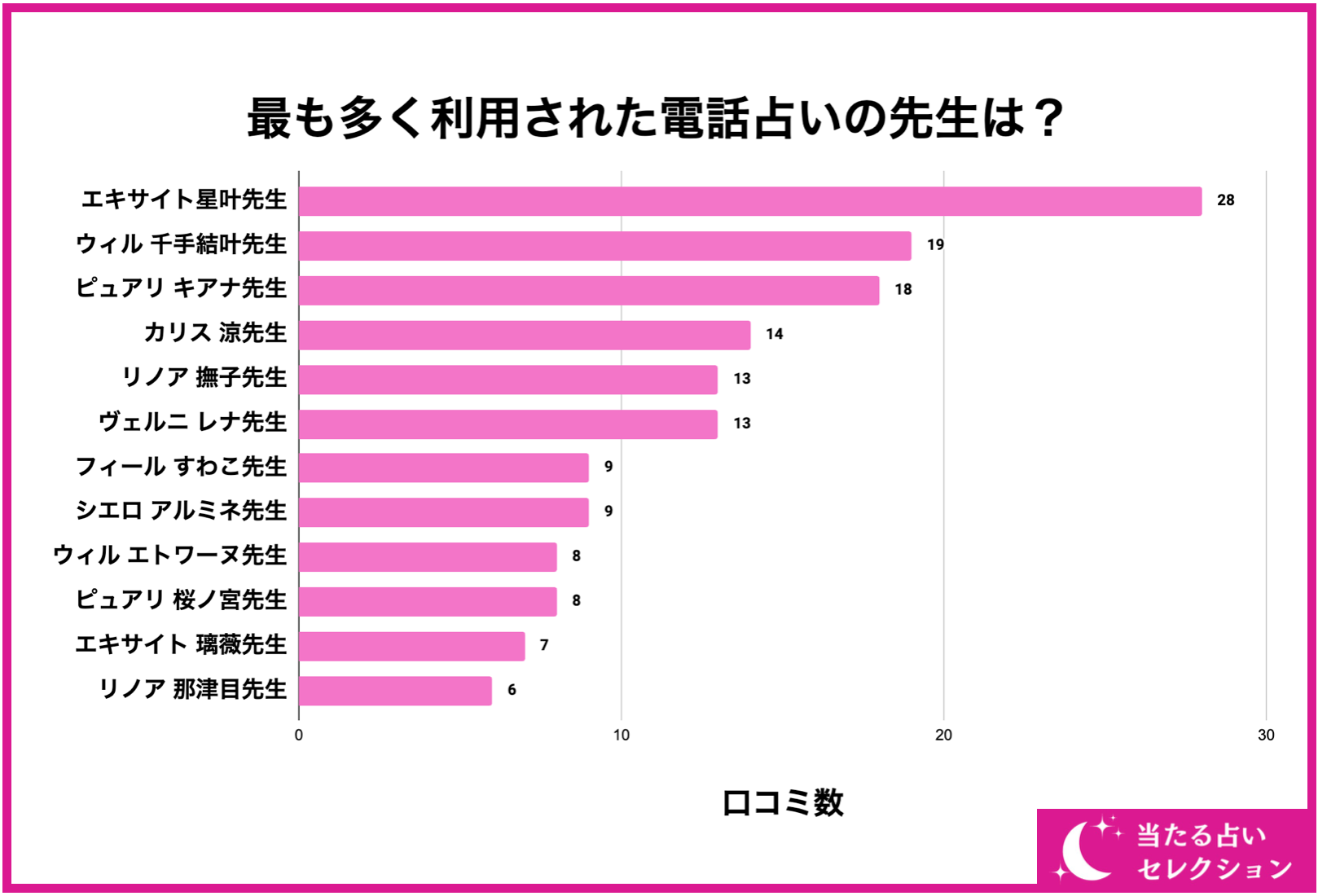 続いて、150名の利用者のうち最も多く利用された電話占いの先生をご紹介していきます。結論から言うと、『エキサイト星叶先生』や『ウィル 千手結叶先生』、『ピュアリ キアナ先生』といった有名な先生が上位となりました。やはり人気の先生は色々な記事や特集で見ることも多く、認知度や知名度が高いため、利用者数も多くなっています。さらに、大手の電話占いほど初回特典やキャンペーンなども豊富で、お得に占ってもらいやすいことも人気の理由と言えるでしょう。