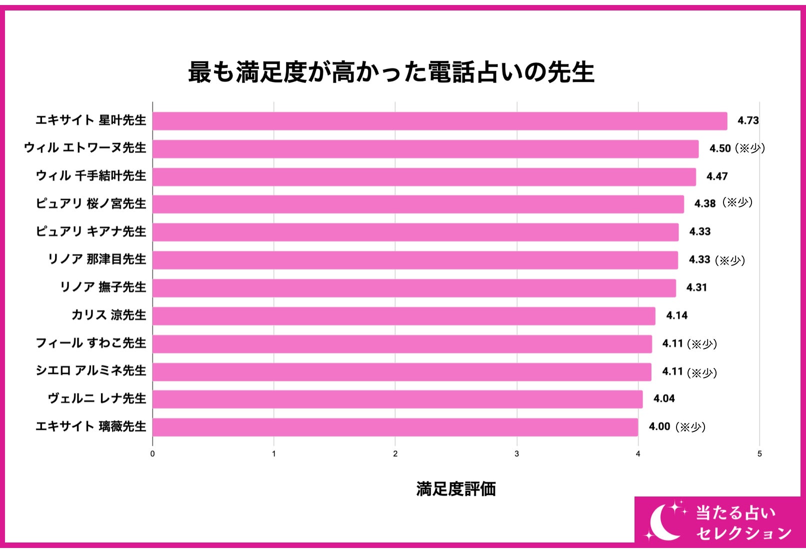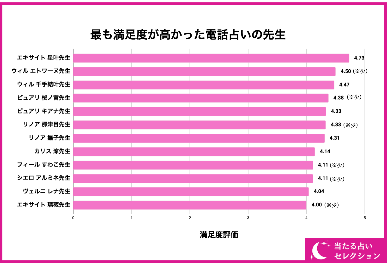 続いて、多くの電話占いの先生の中で最も満足度評価が高かったのはどの先生なのでしょうか?結論から言うと、画像の通り「エキサイト 星叶先生」が満足度評価「4.73/5.00」で最も評価が高いことが分かりました。