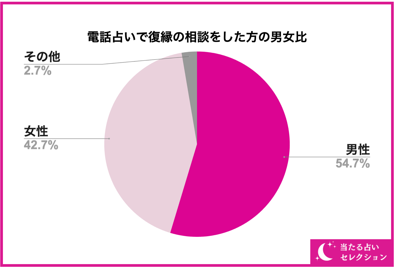 まず初めに、電話占いで復縁を相談する方の男女比についてご紹介していきます。電話占いで復縁を相談する男女の比率は画像の通り、男性が約54%、女性が約42%の結果となりました。電話占いで復縁を相談する人は女性が大多数というイメージが多いかもしれませんが、約54%(半分)が男性という結果になりました。