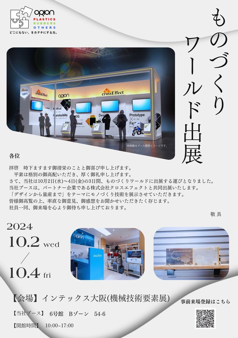 オリオン株式会社はパートナー企業の 株式会社クロスエフェクトと共同で、2024年10月2日(水)~4日(金)の3日間、インテックス大阪で開催される「ものづくりワールド(第27回 機械技術要素展)」に出展します。