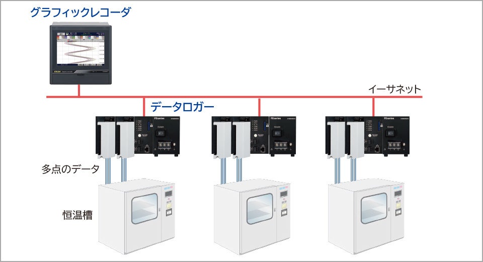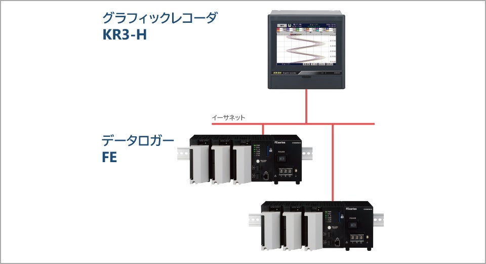 今回発売するKR3-Hシリーズ500点集録仕様は従来タイプでは最大で120点だった計測ポイントが500点まで大幅に拡張ました。これにより1台のグラフィックレコーダで最大500点の計測ポイントを集中監視できるようになりました。また、7月に発売した「アナログ入力」「デジタル入力」「デジタル出力」「通信」「電源」の機能を持つモジュールで構成されたデータロガーFEシリーズと組み合わせればセンサ・電源・通信線以外の配線が不要となり、多点計測もすっきりと集中監視することができます。(センサ入力が48点を超える場合はFEシリーズが必要です。)