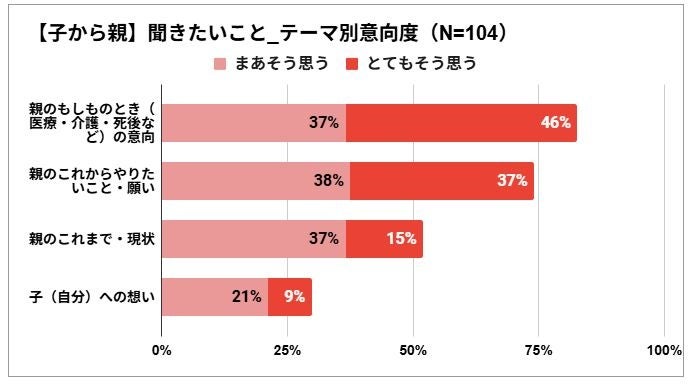 <子から親>への聞きたいことの第1位は「もしものとき(介護・医療・死後など)の意向」で83%。2位は「これからの願い」で75%。子は親の”これからのこと”を聞きたい傾向が表れた