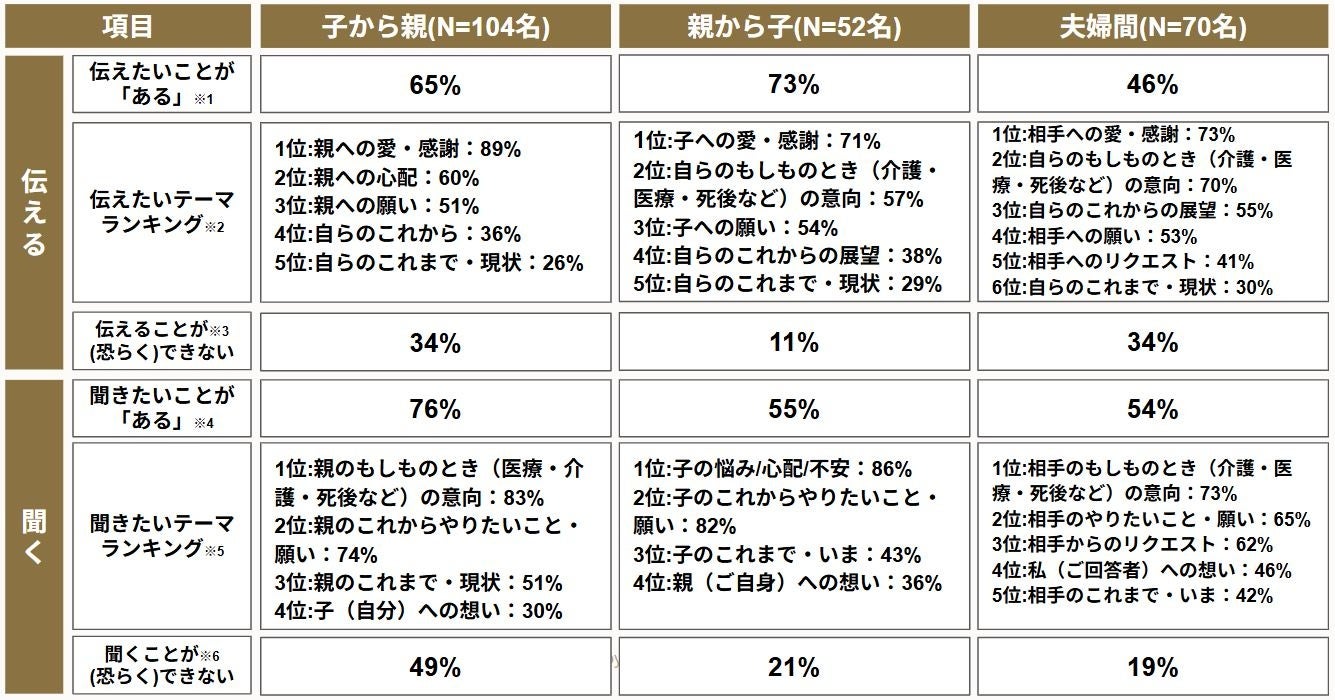 本調査では、子の65%に「親に伝えられていないけれど、伝えたいこと」があり、第1位は「愛・感謝」であること。76%に「親に聞きたいけれど聞けていないこと」があり、第1位は「もしものとき(介護・医療・死後など)の意向」であることがわかりました。
