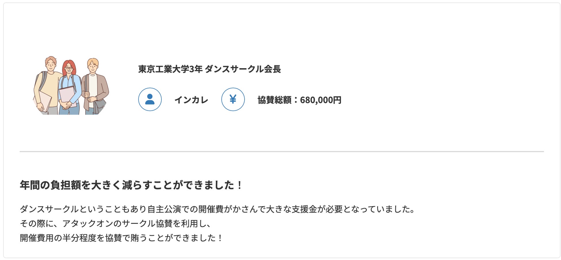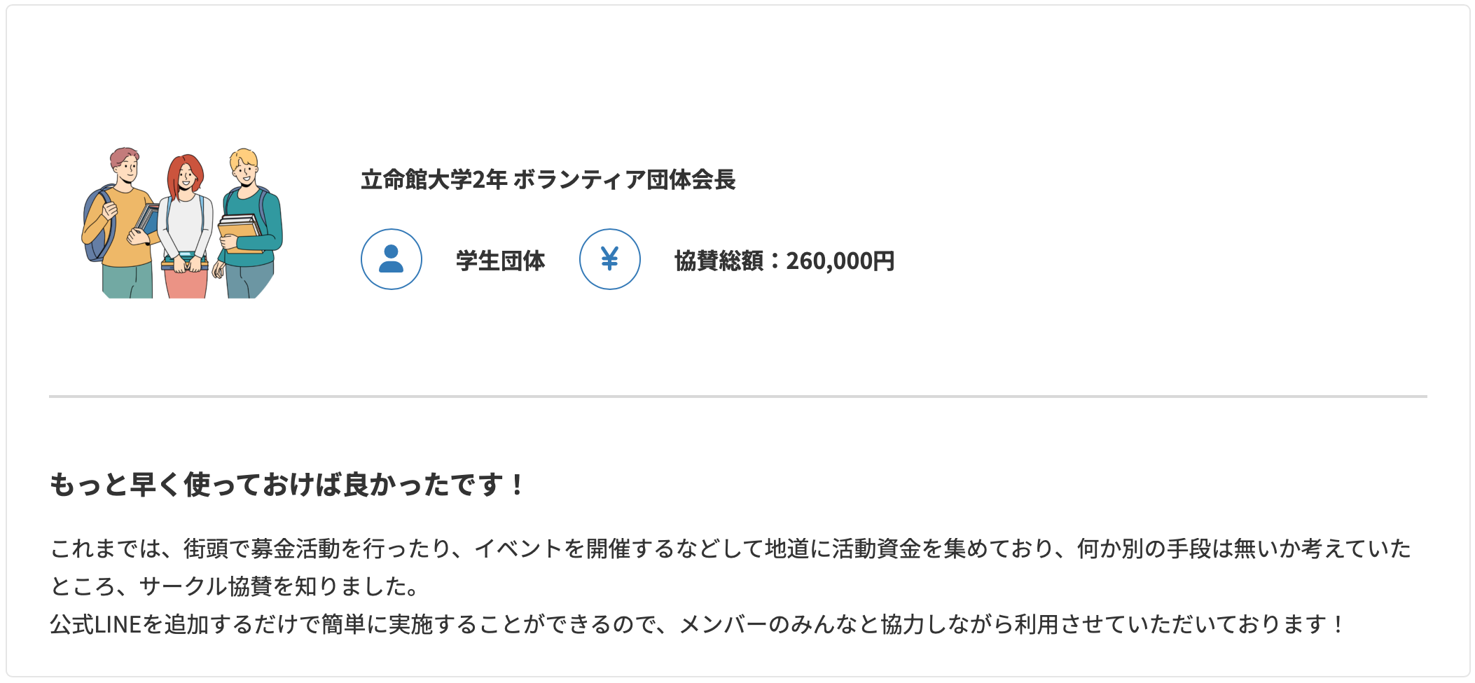 協賛を一度も導入した経験のない団体様でも年を跨いでご利用いただくケースが非常に多く、人数の多い規模感のあるサークルの場合だと以下のような嬉しいお声もいただいております。